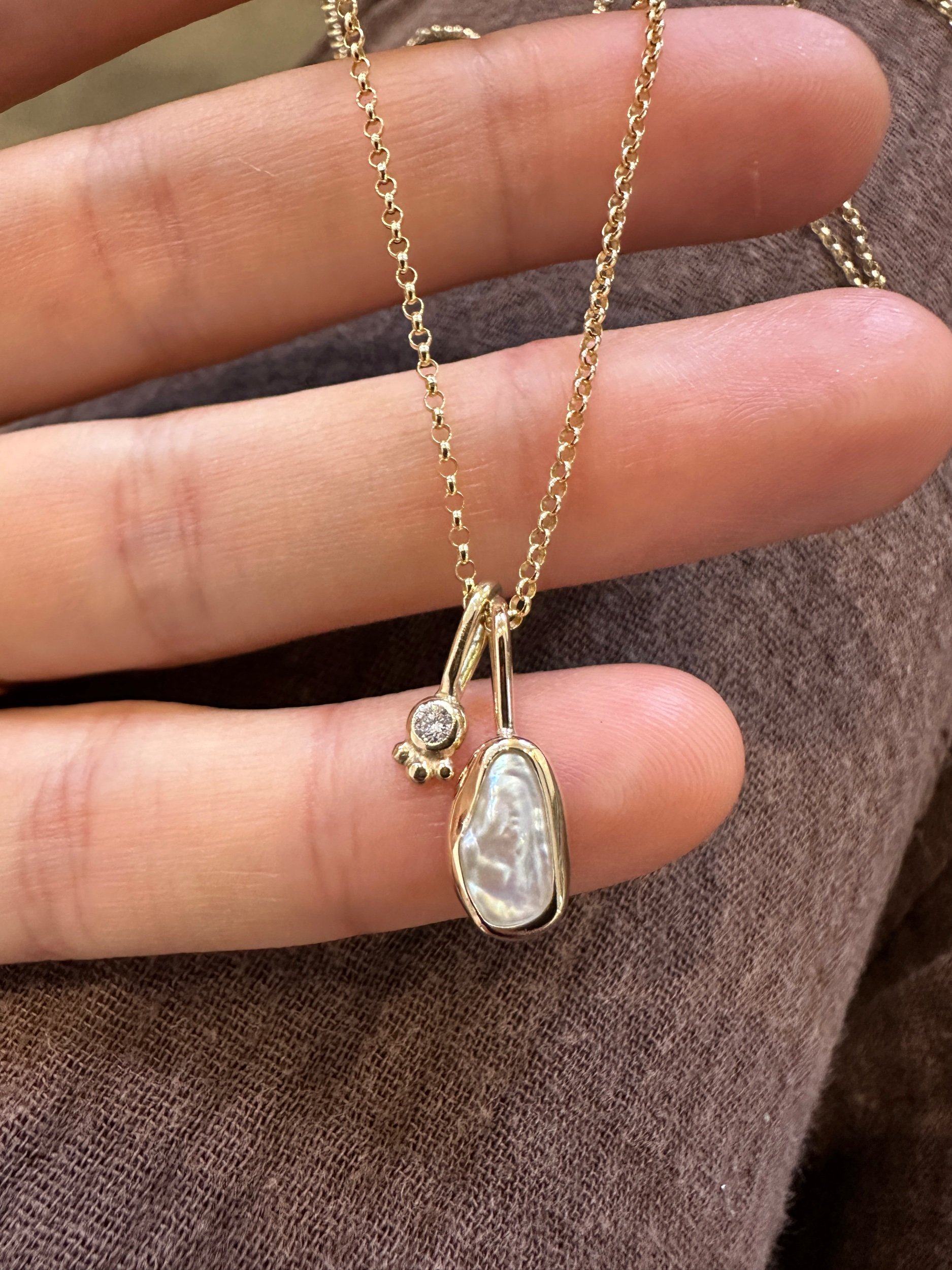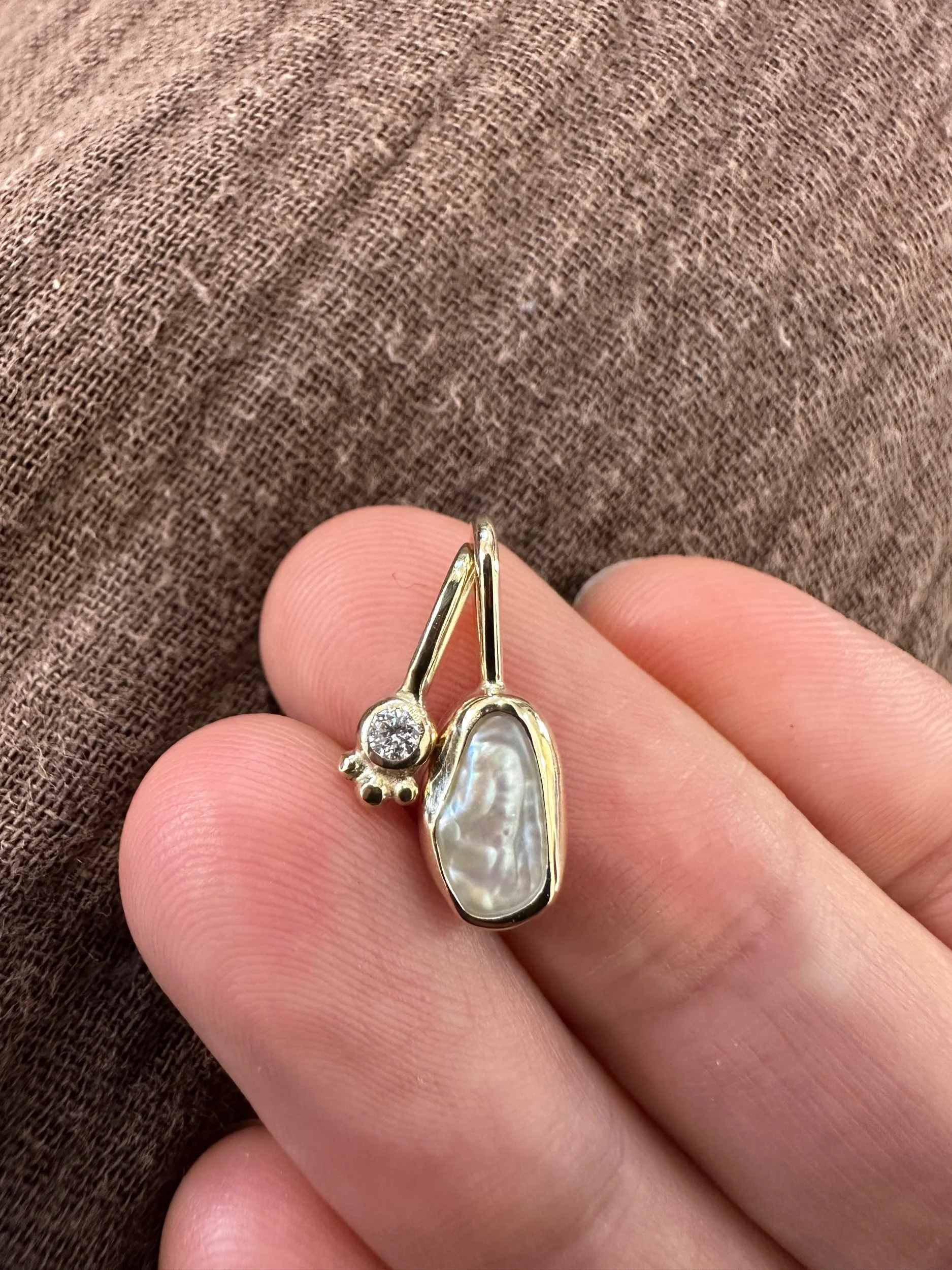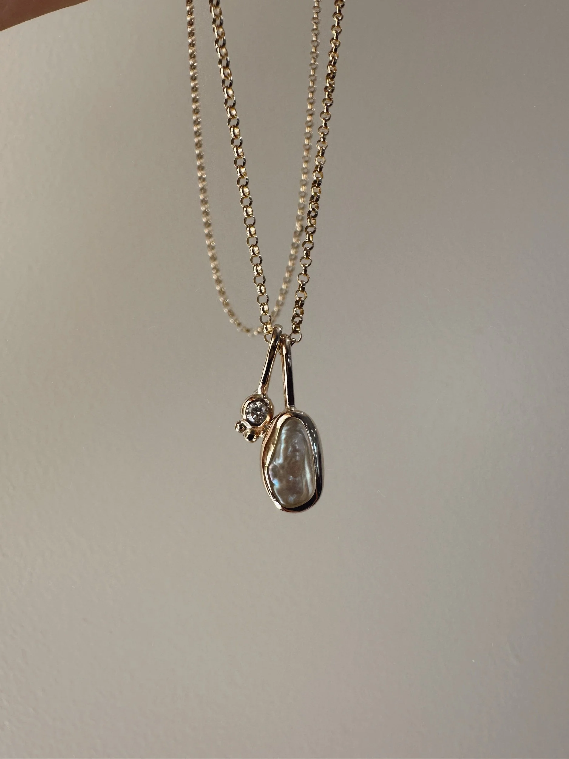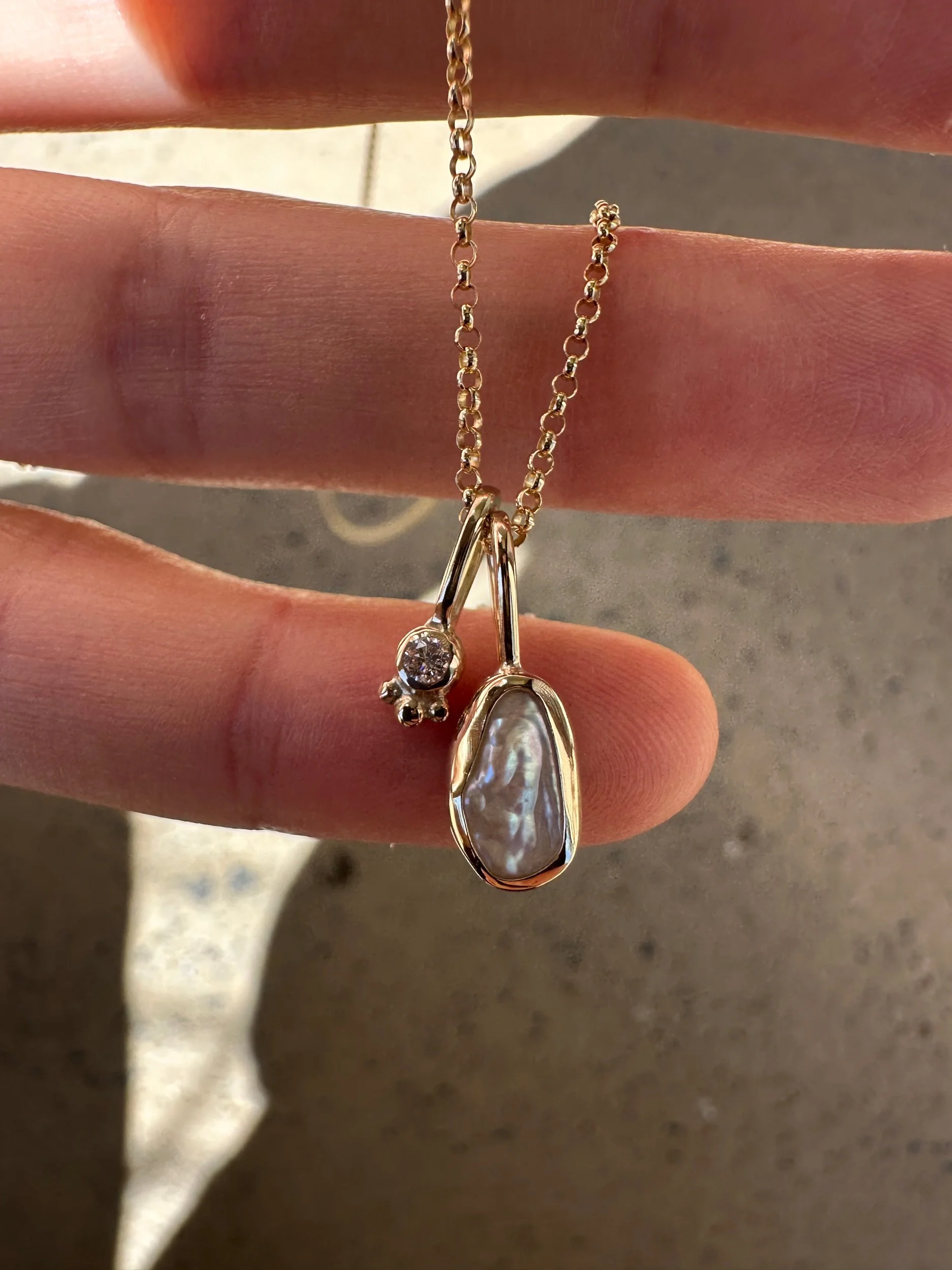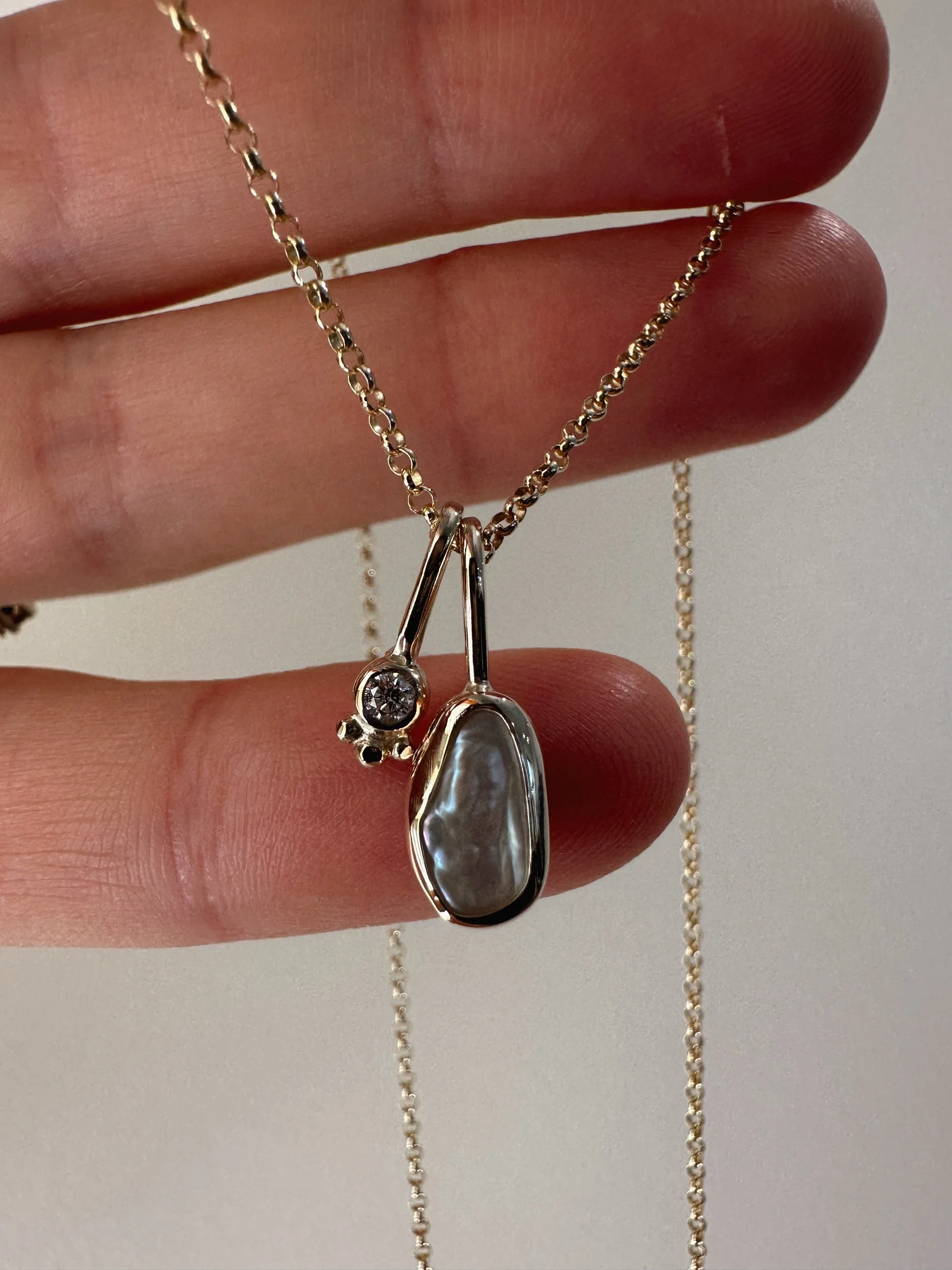 A bright white, wonky pearl wrapped in a snug bezel, paired with a second pendant which is set with a 2mm lab grown diamond.