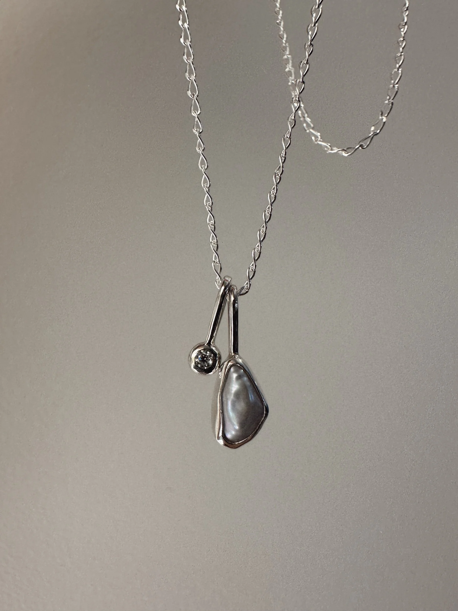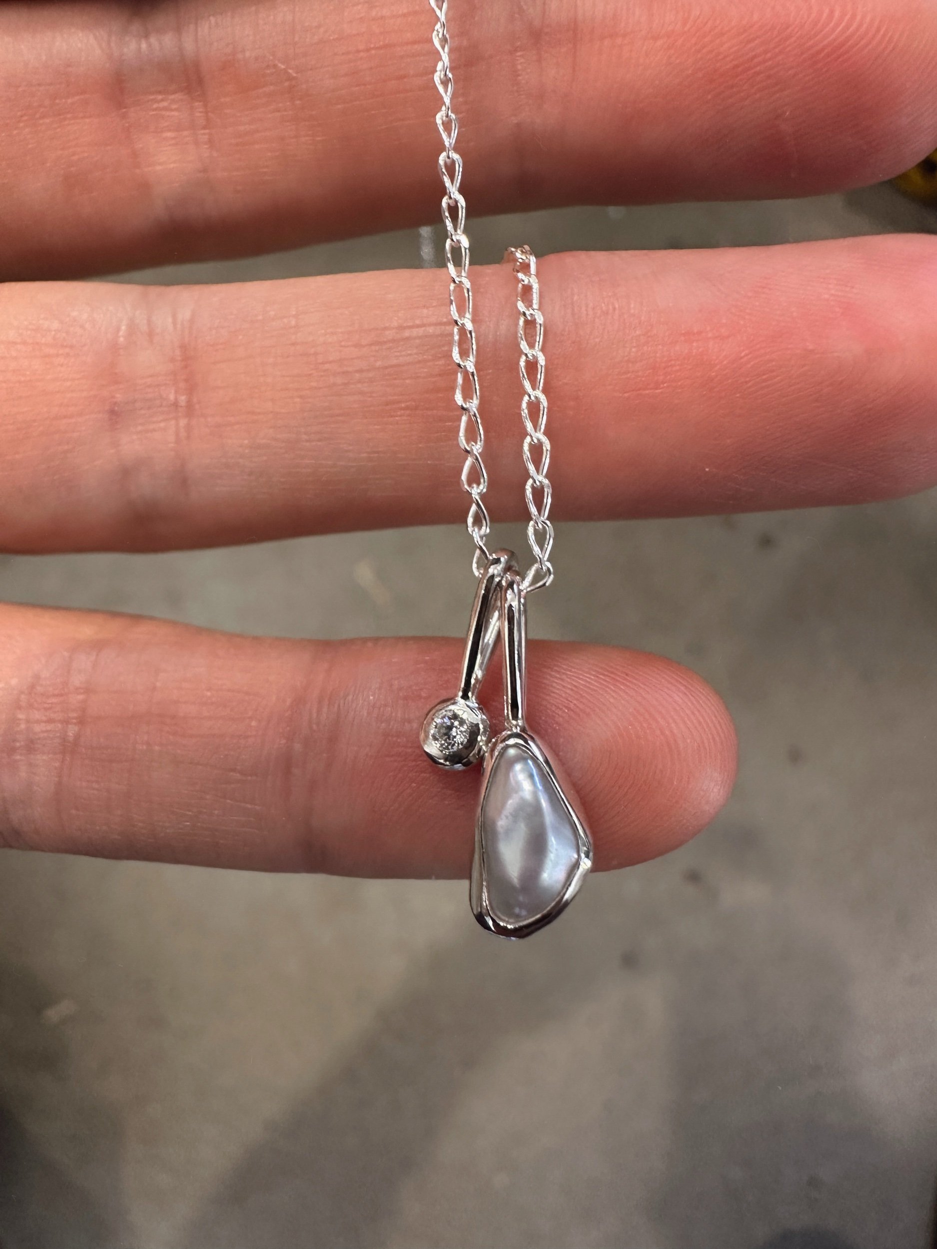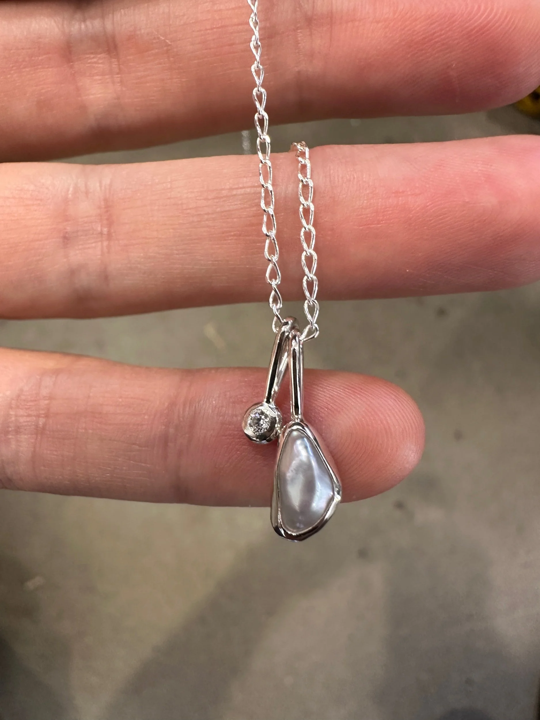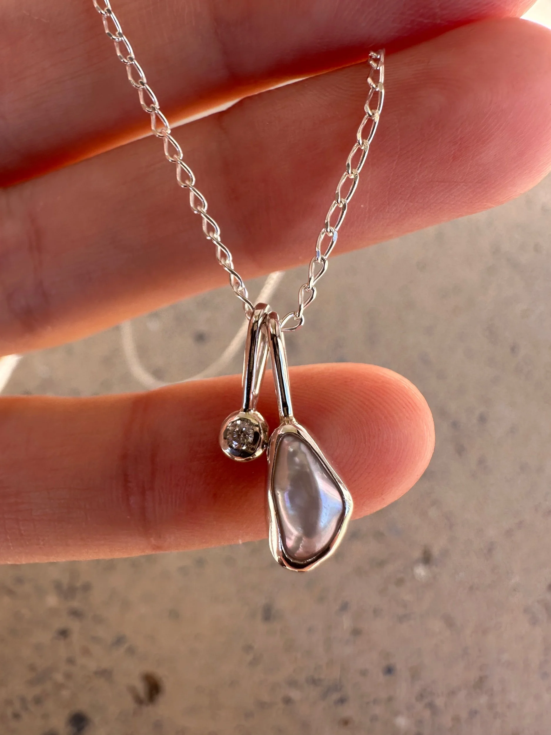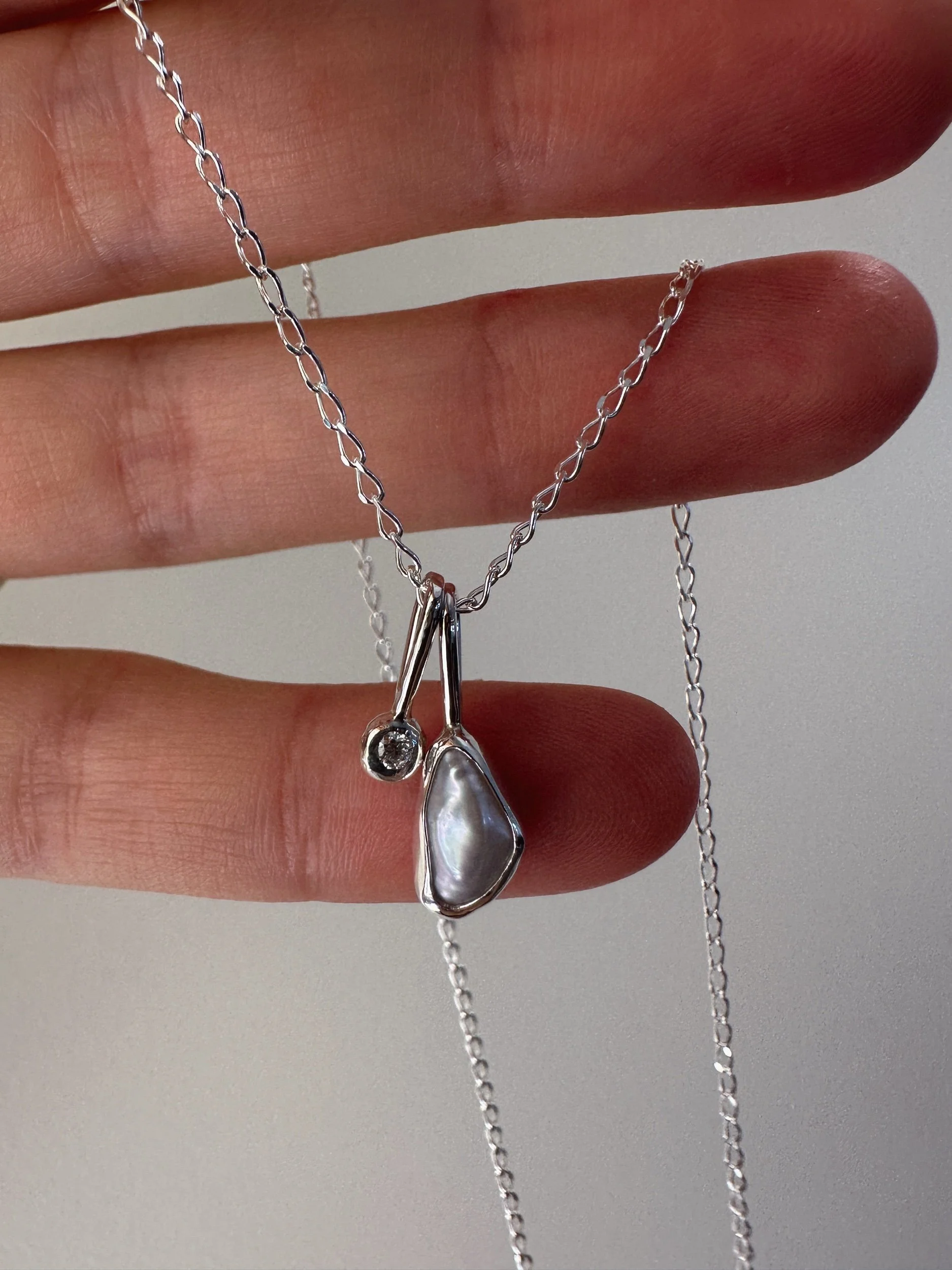 A bright white, wonky pearl set in a snug bezel. Paired with a sweet charm which is set with a 2mm moissanite.