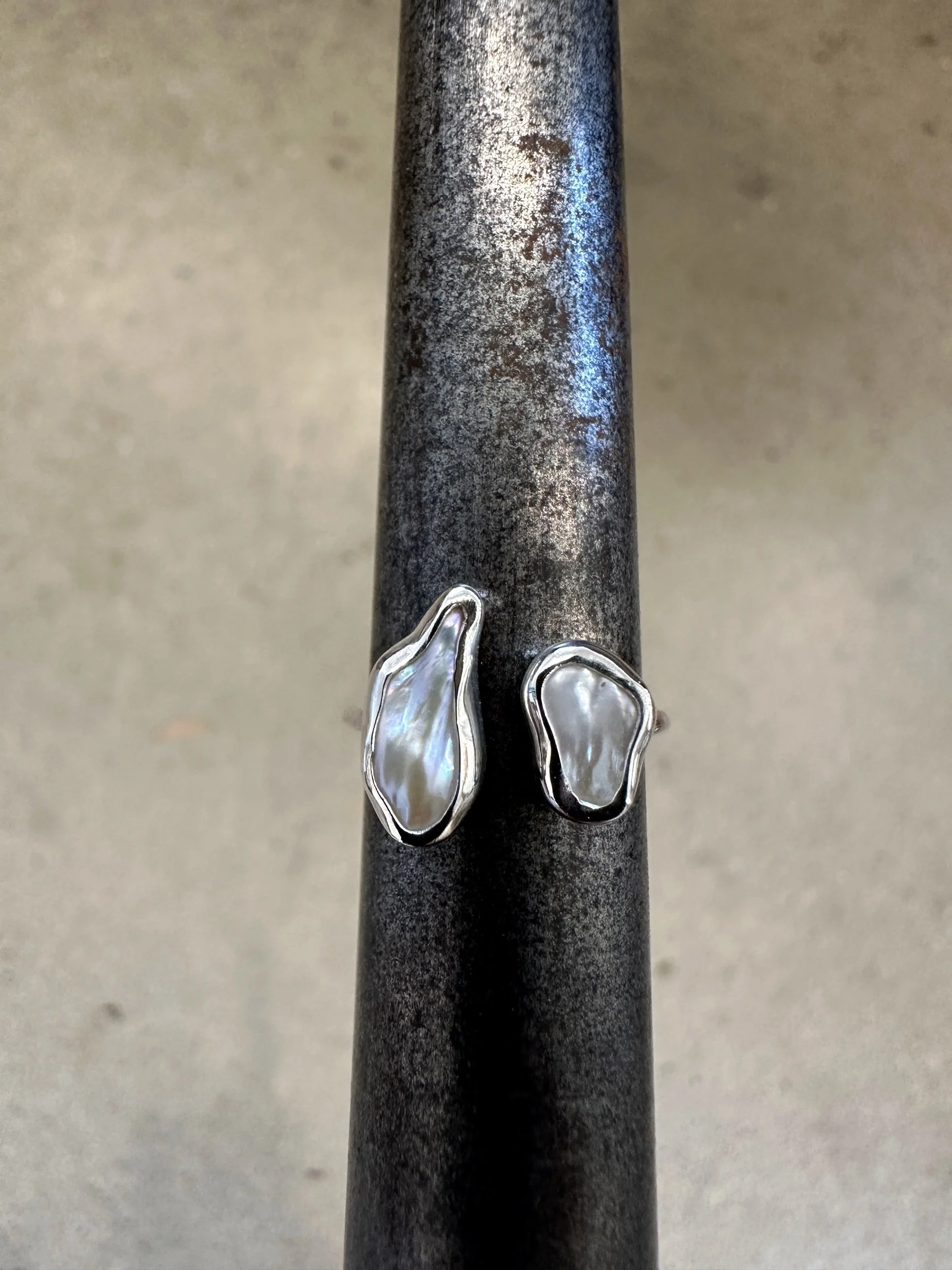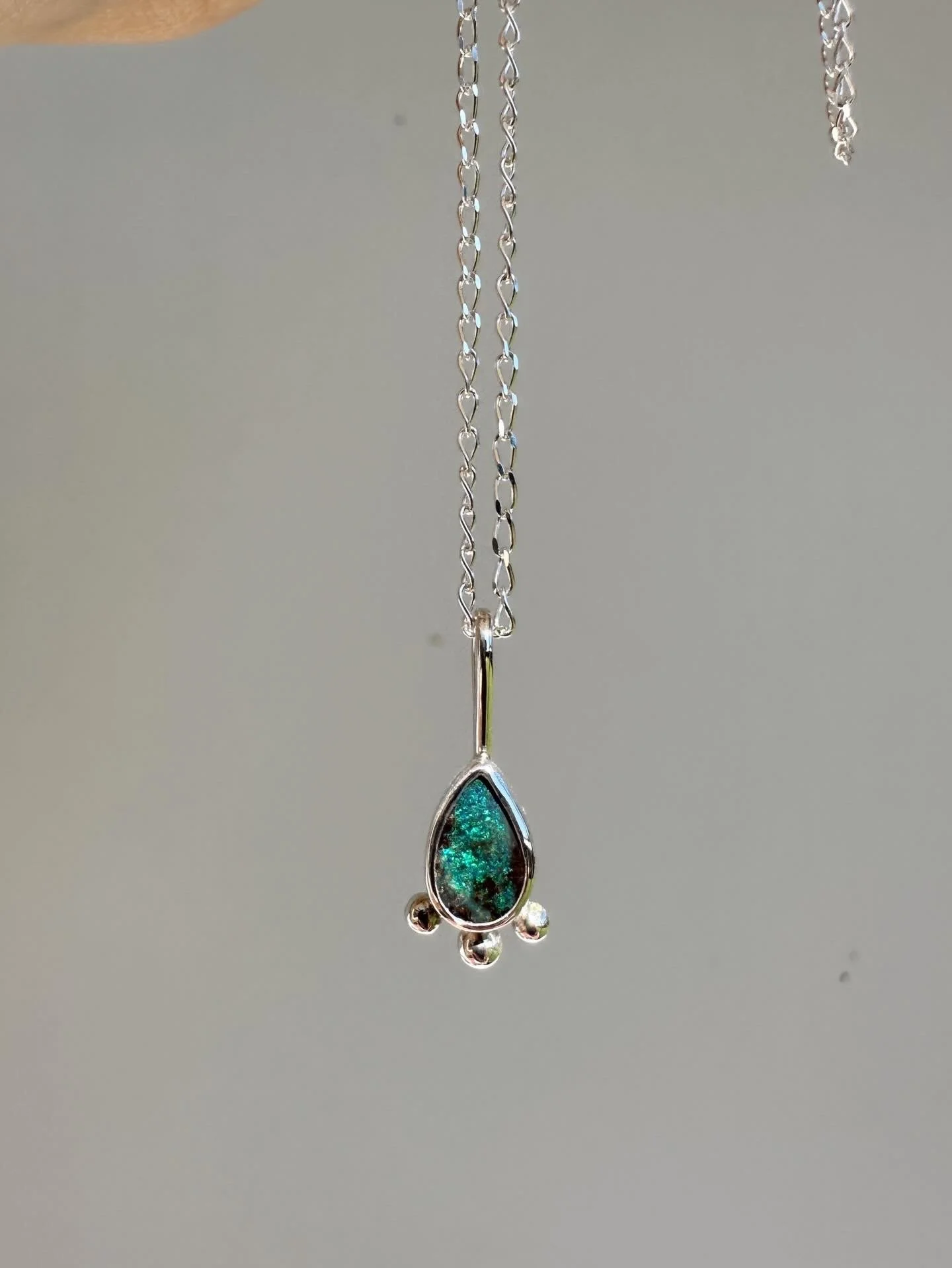 An aqua hued QLD boulder opal set in a snug silver home. Finished off with silver dots.