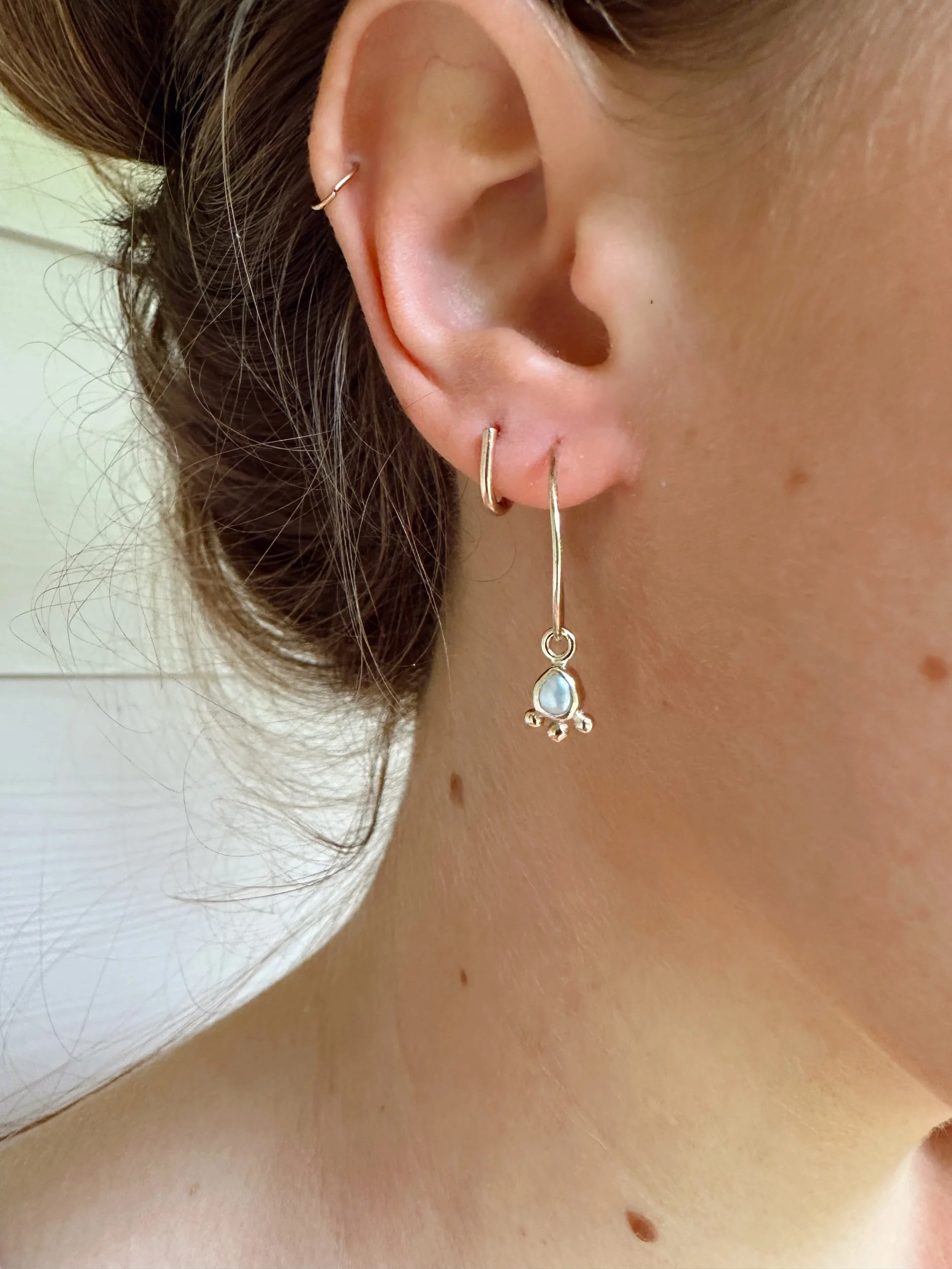 Wonky freshwater pearls wrapped in golden bezels adorned with chunky gold dots. Dangling from hand shaped, oversized hoops.