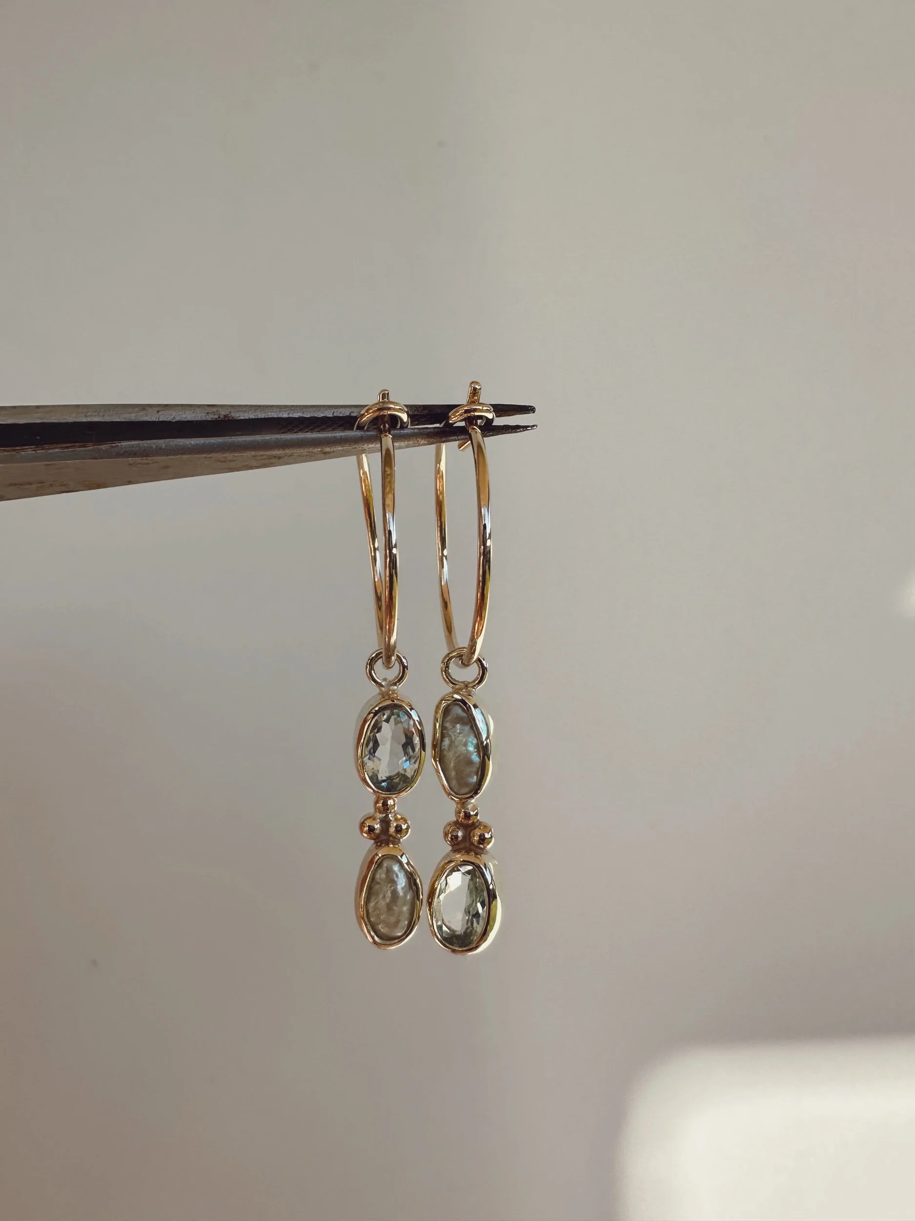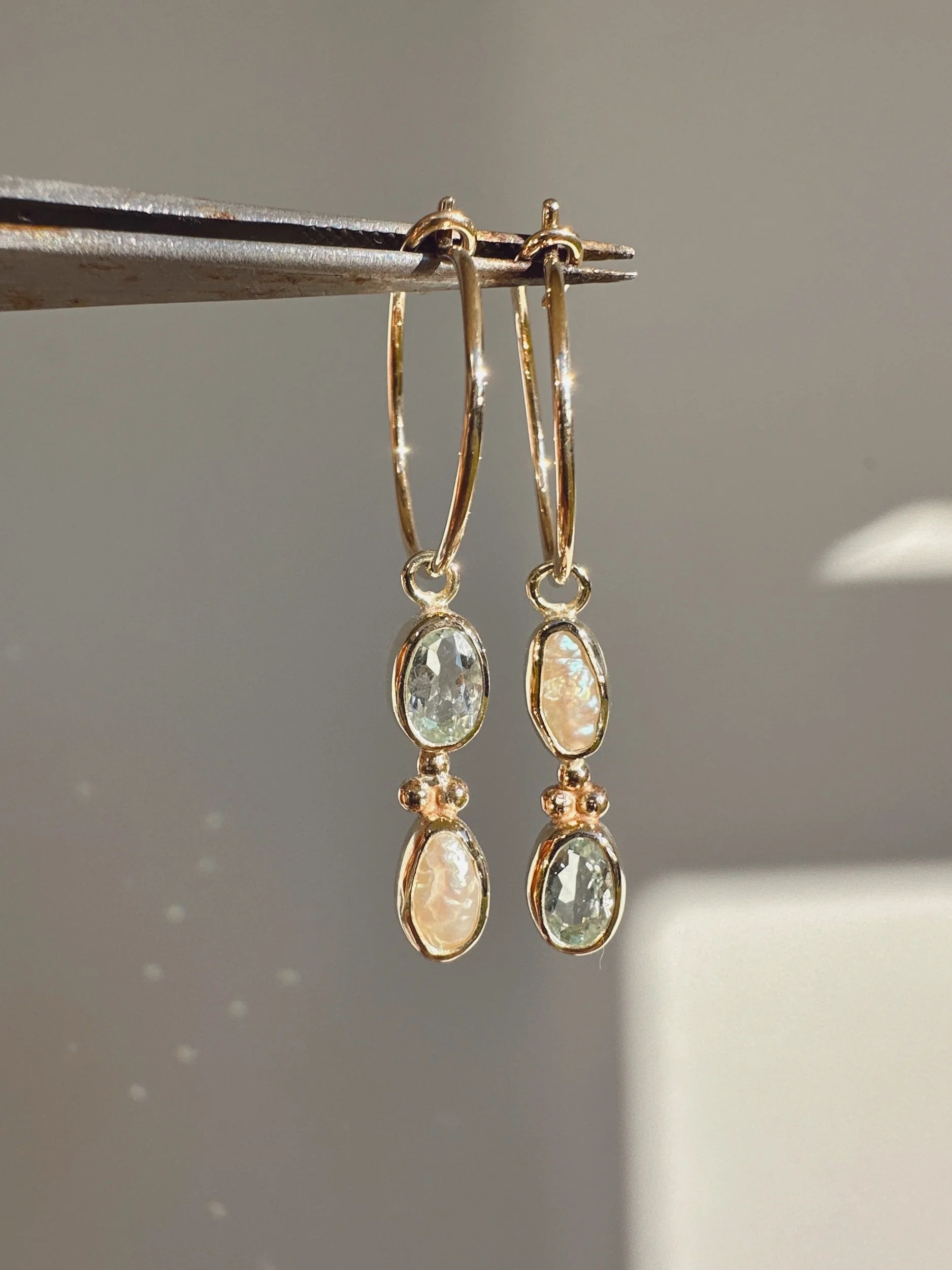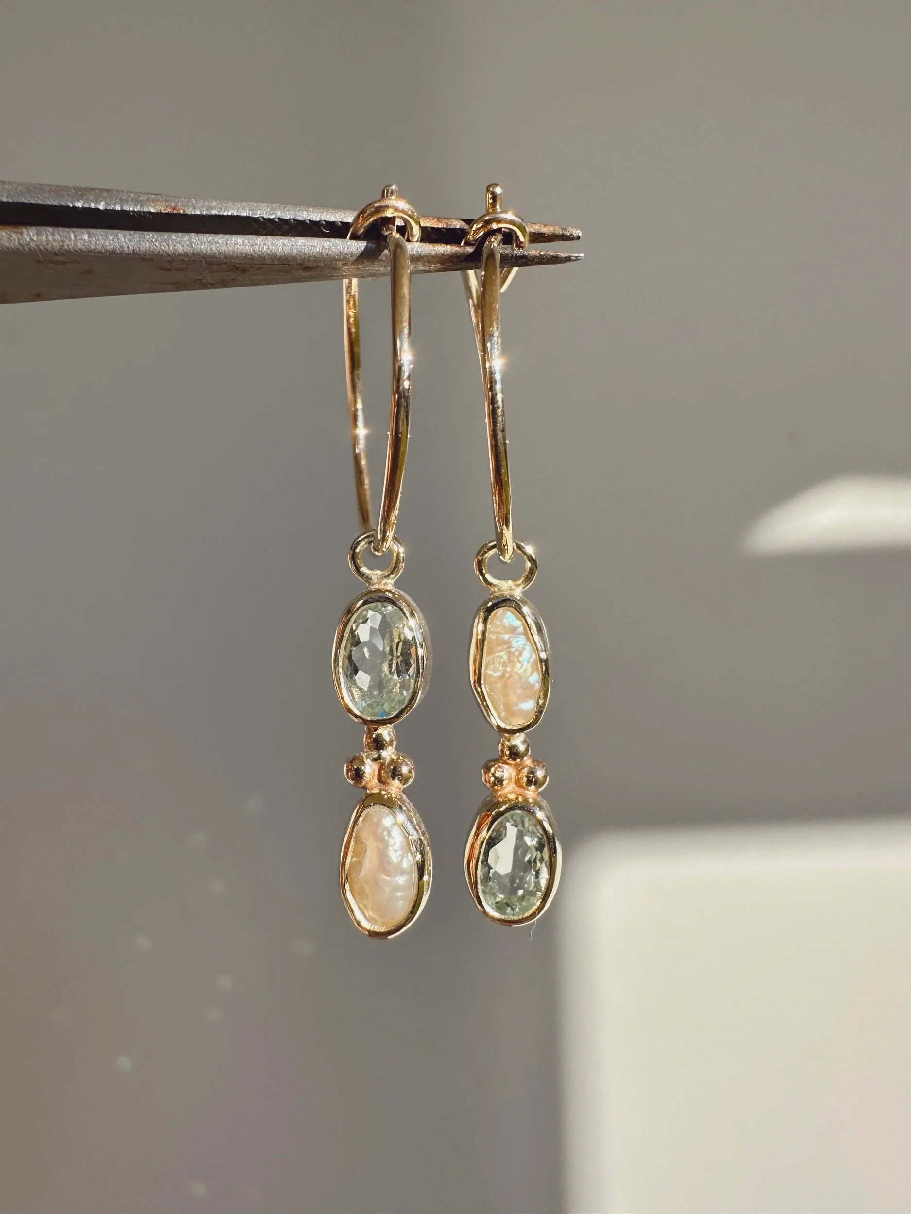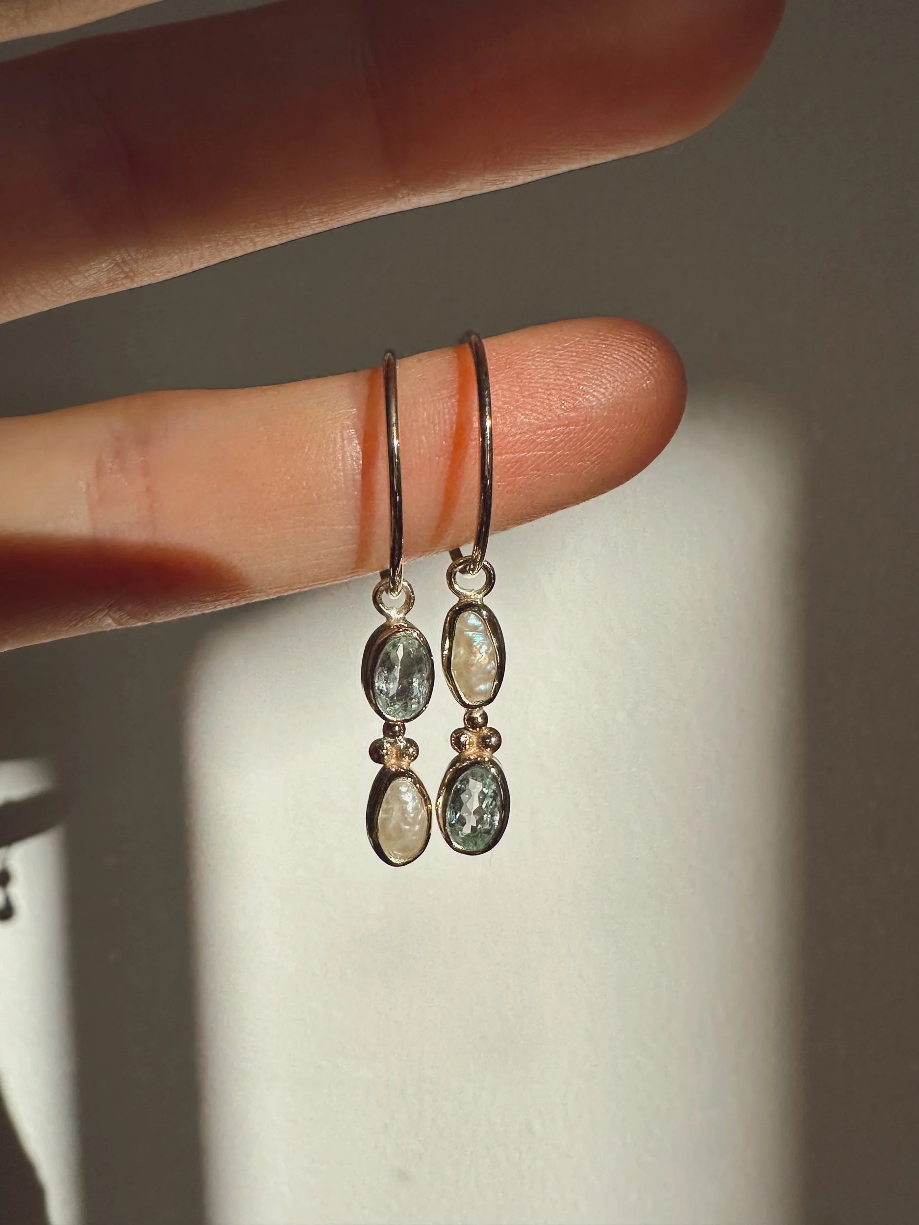 A divine pair of earrings each with a wonky pearl paired with a pale blue aquamarine.