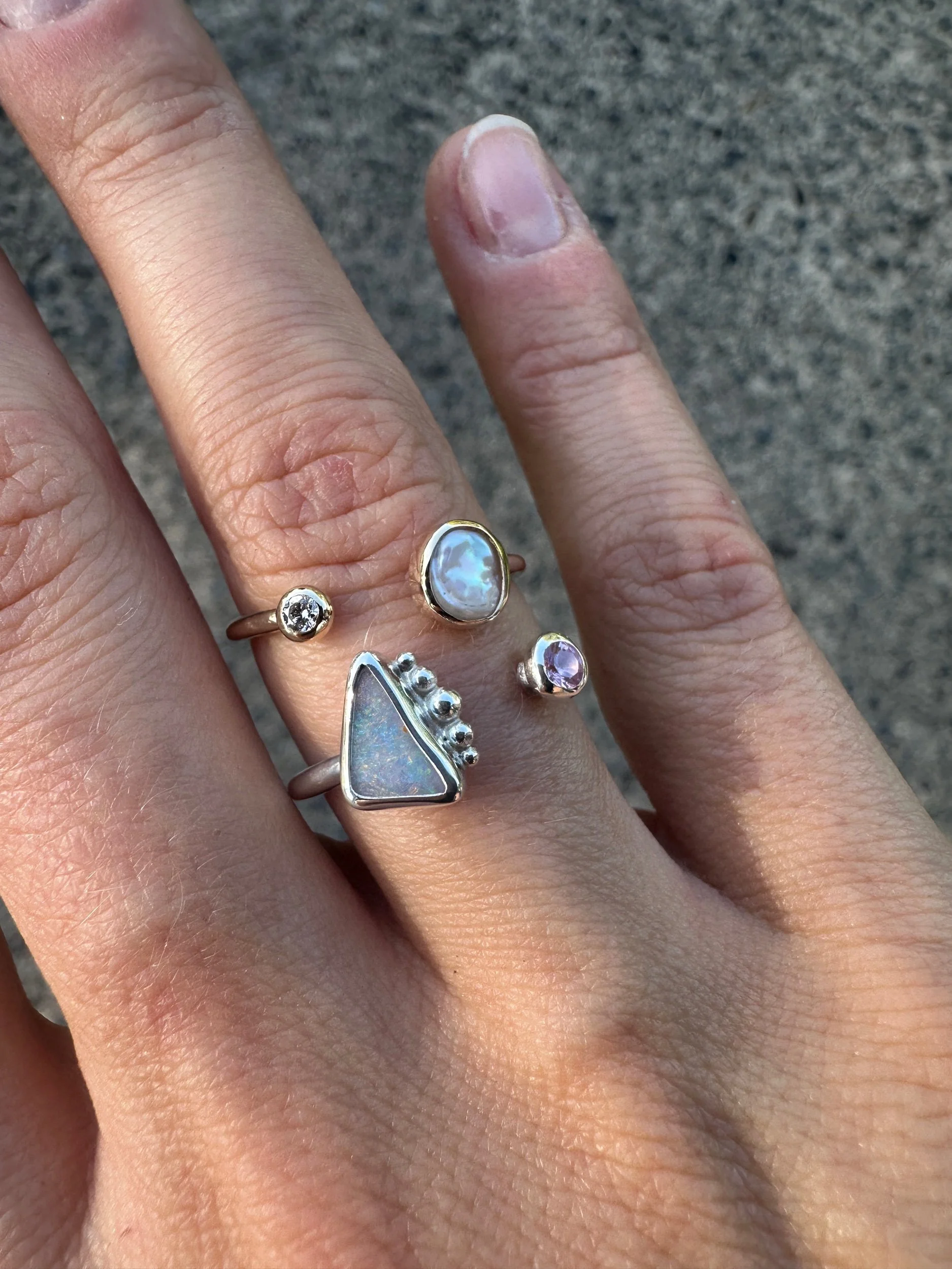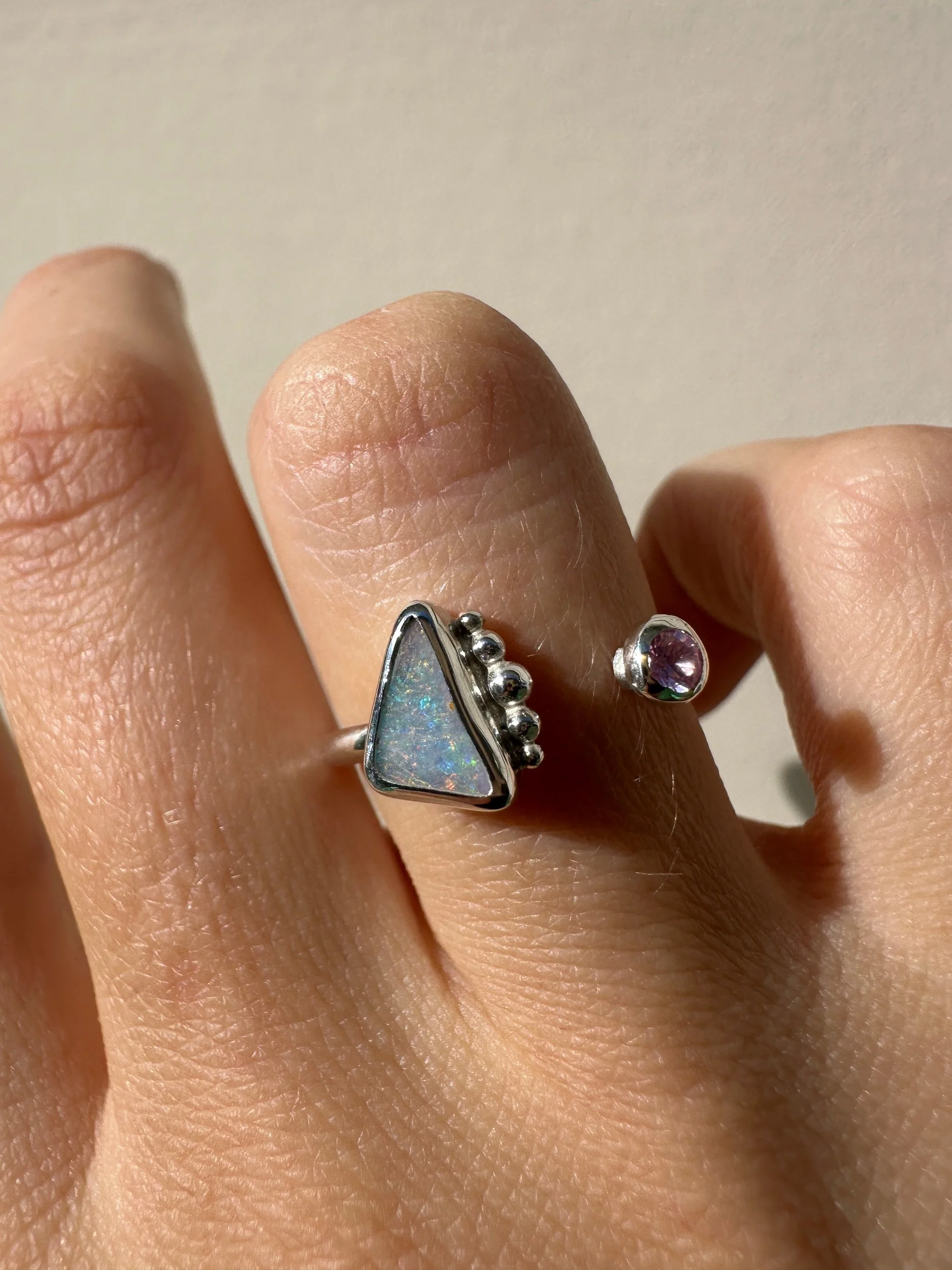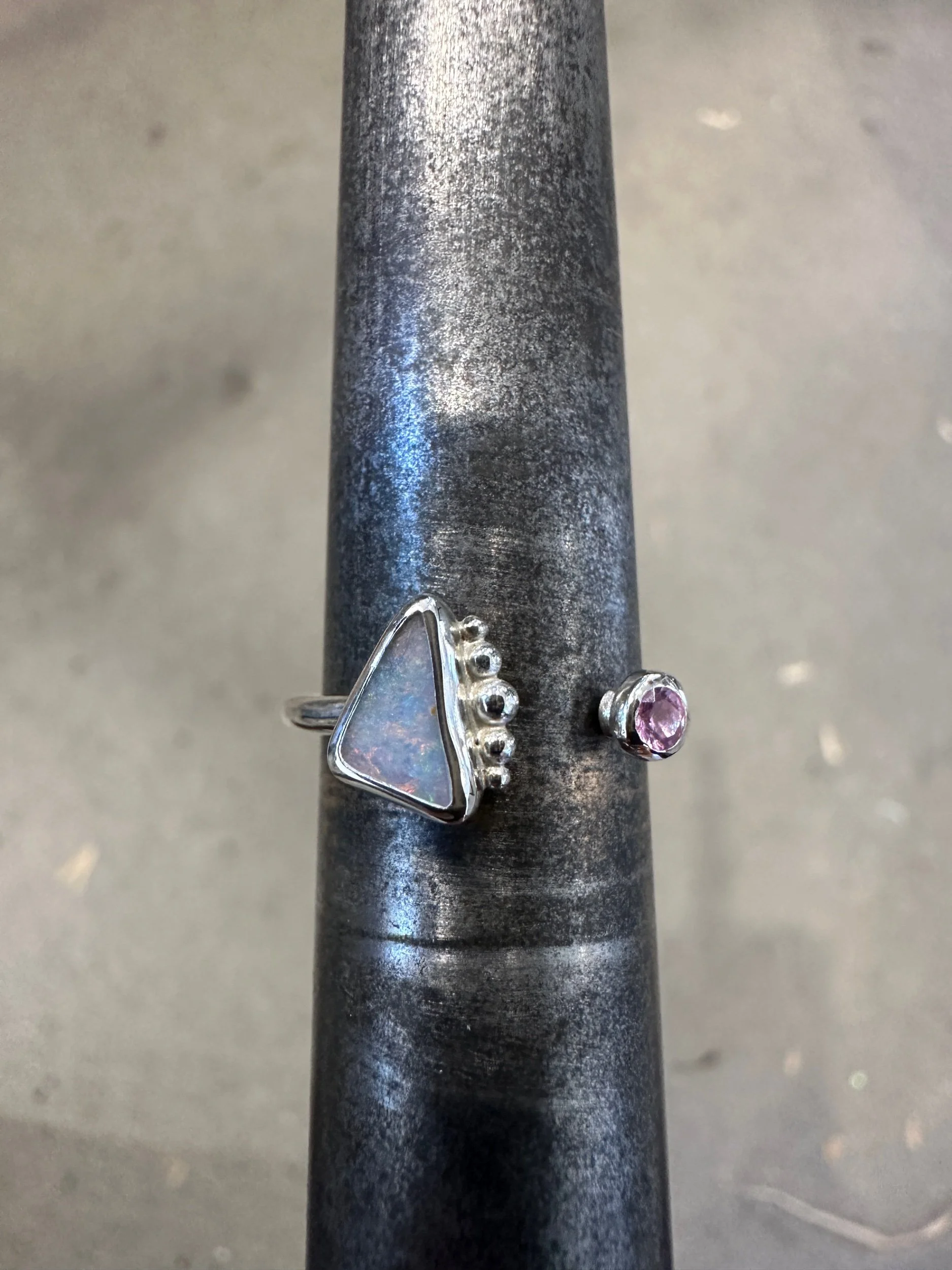 A boulder opal filled with pastel hues of pink, blue and green. Paired with a 3mm pink topaz.