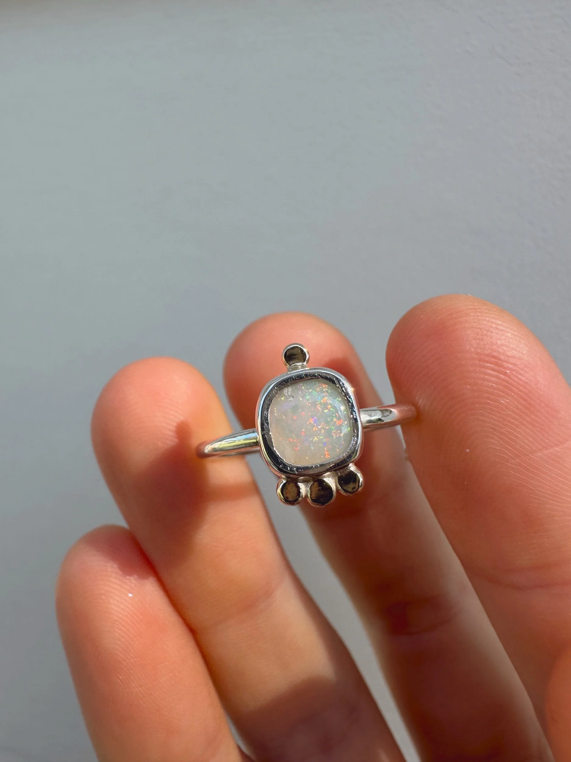 A sweet, milky opal displaying speckled hues of green, pink and blue.
