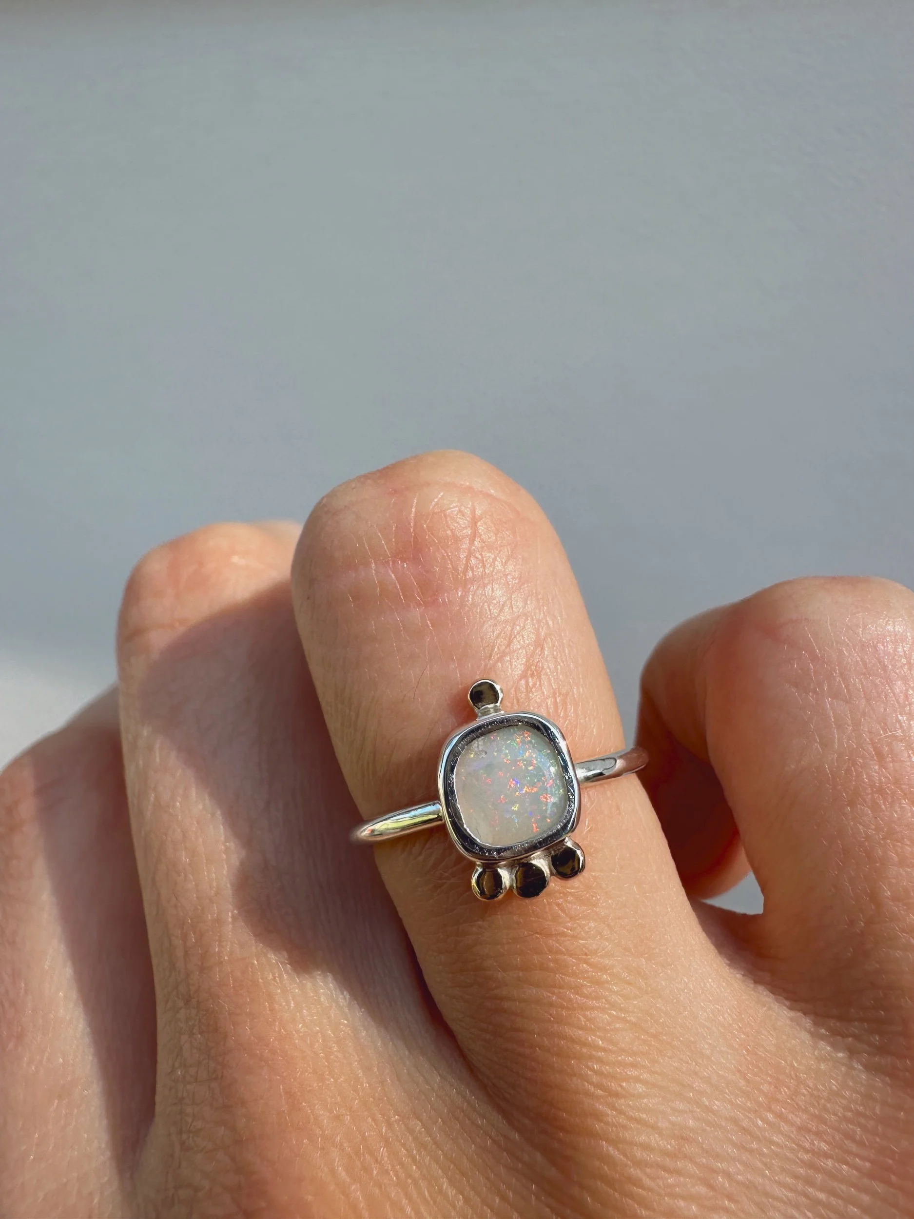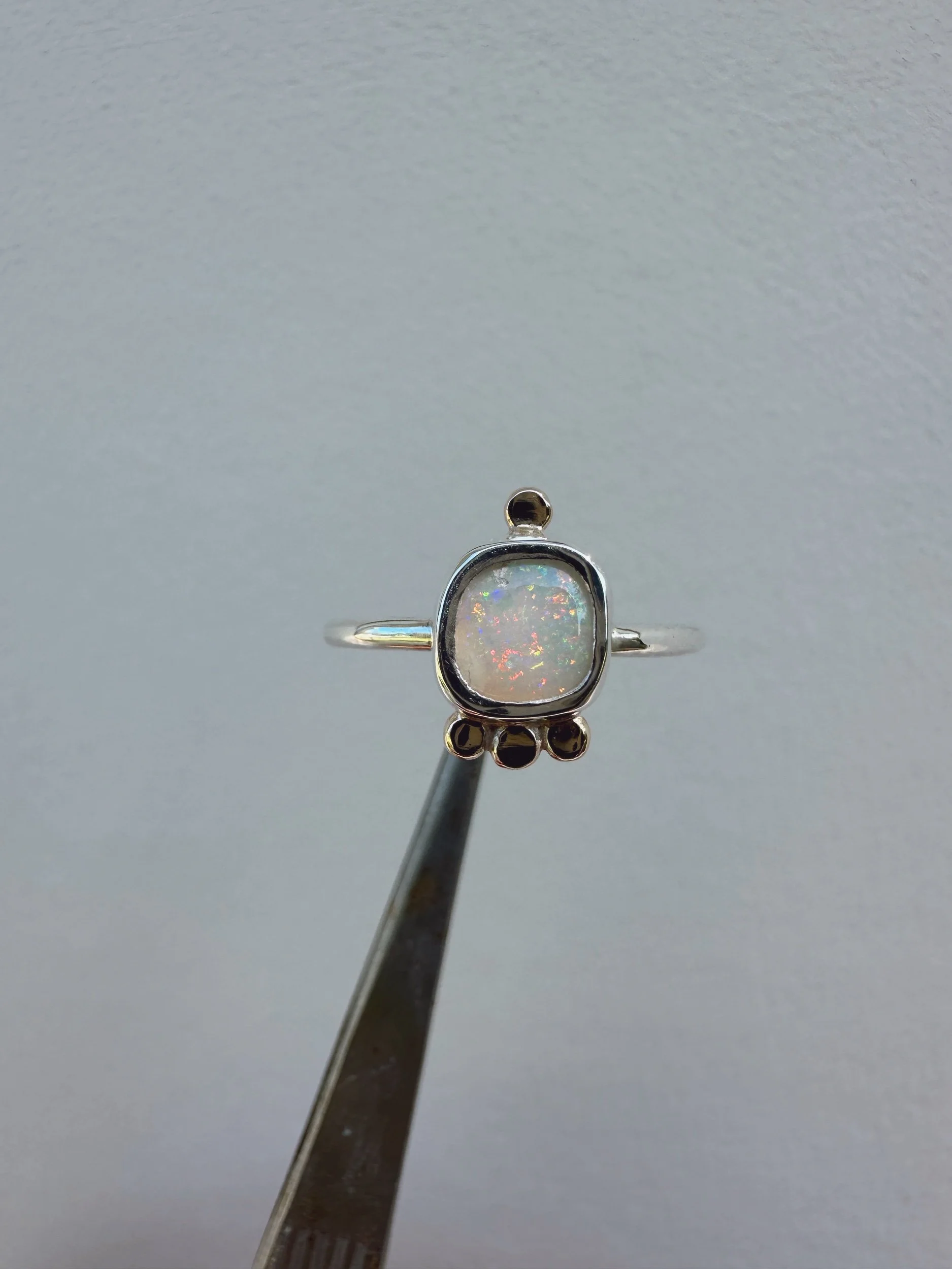 Set in a snug silver bezel and band, and adorned with solid 9ct gold dots.