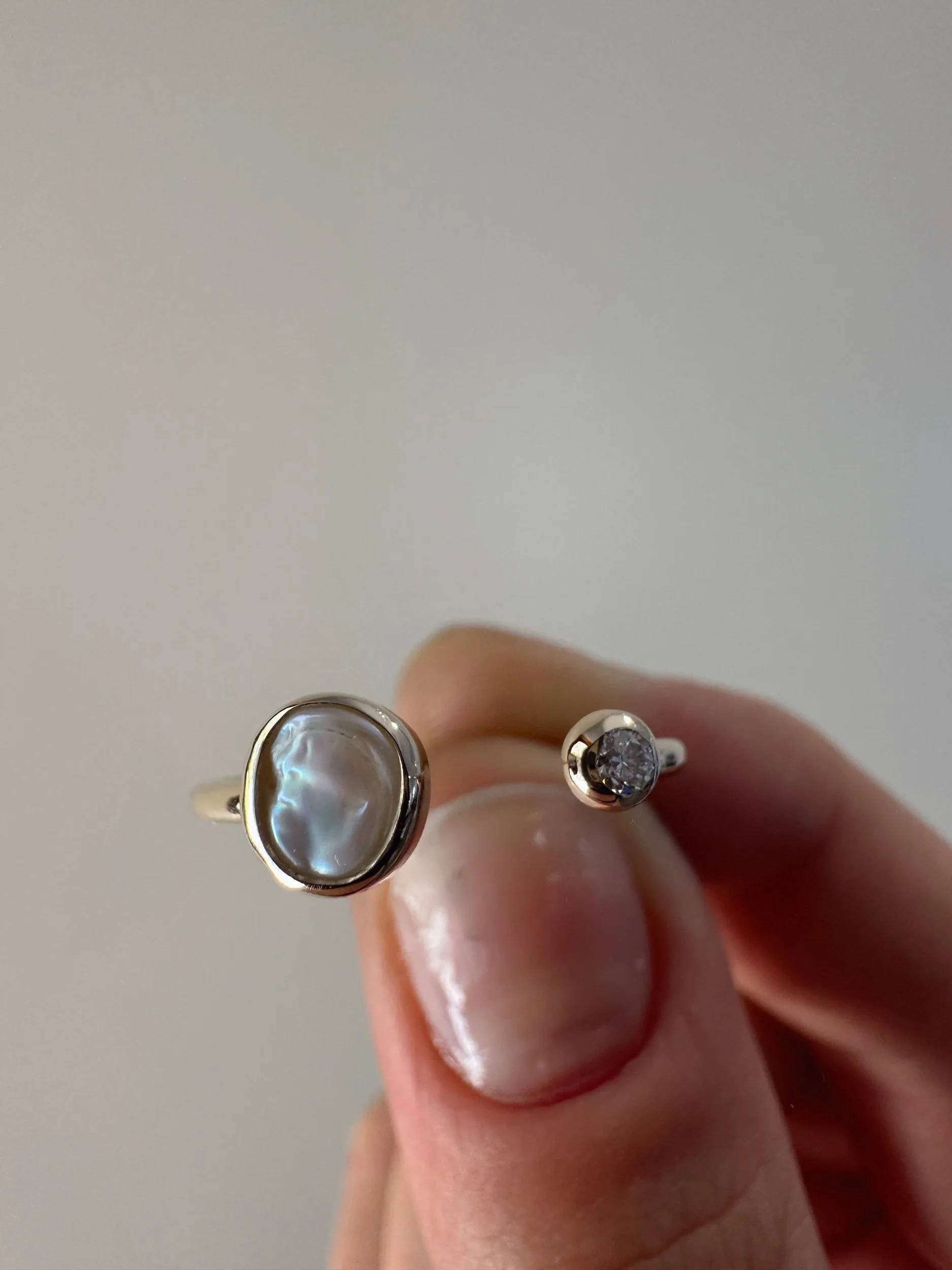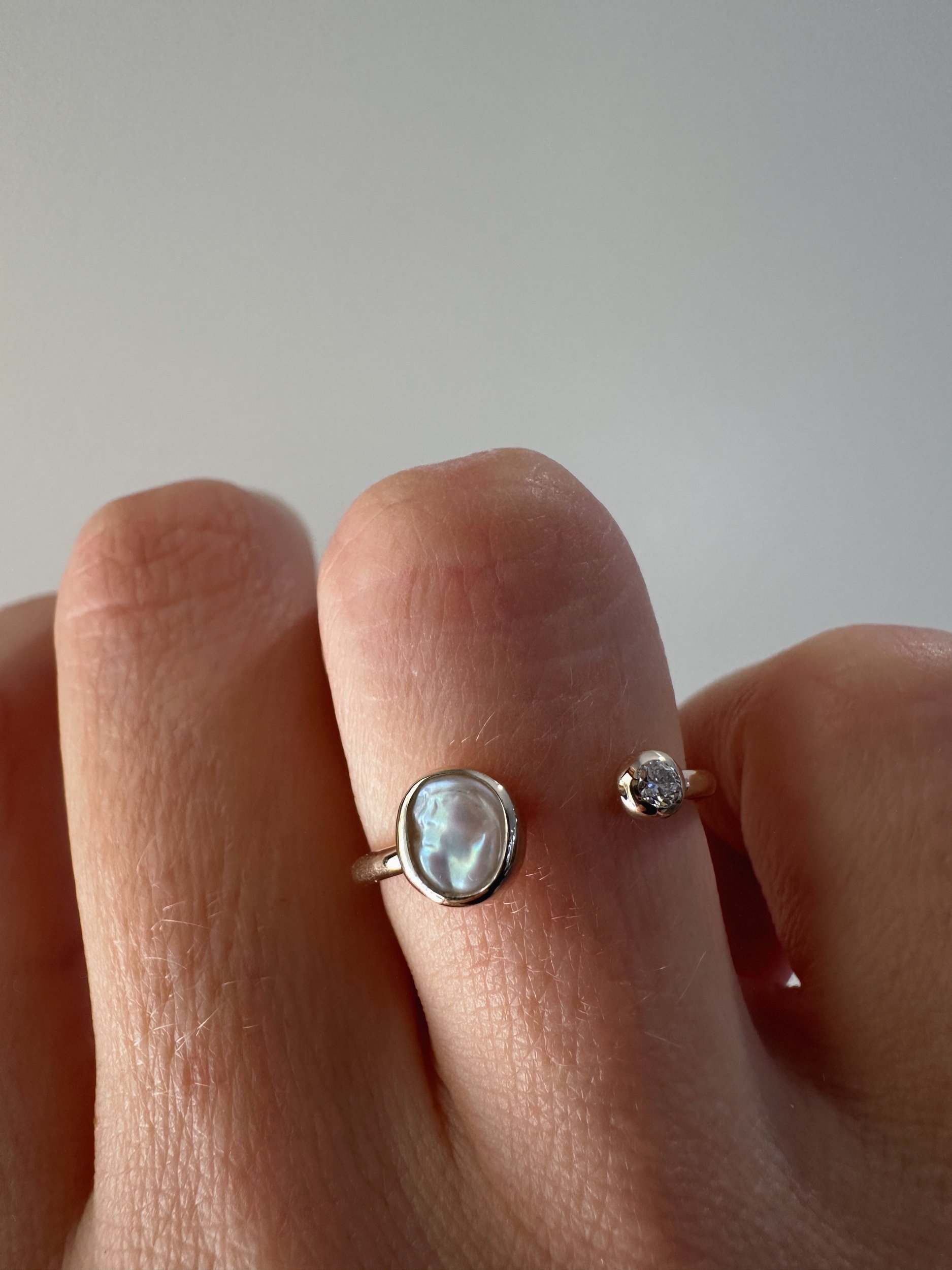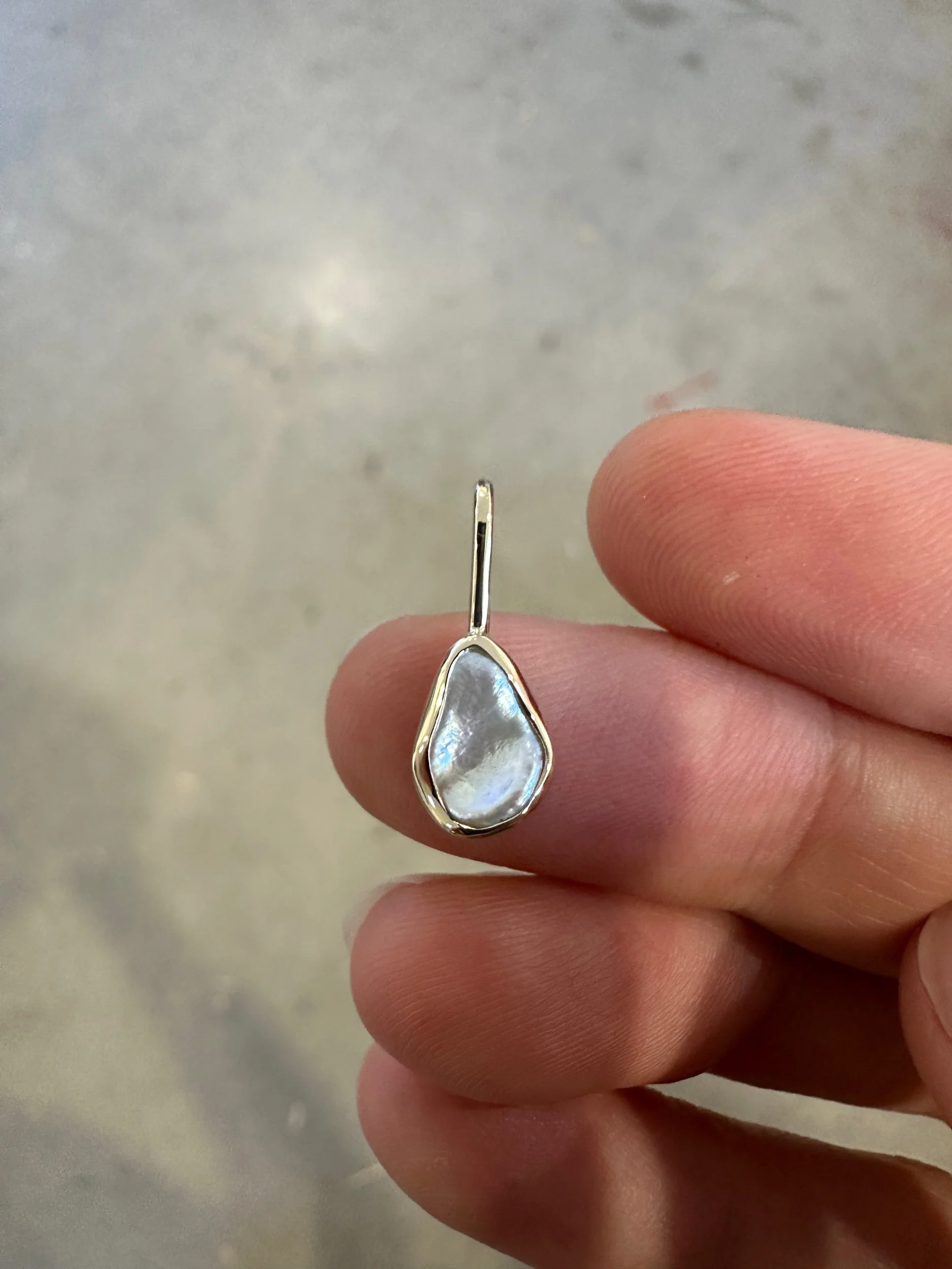 A bright white, wonky pearl set in a snug bezel.