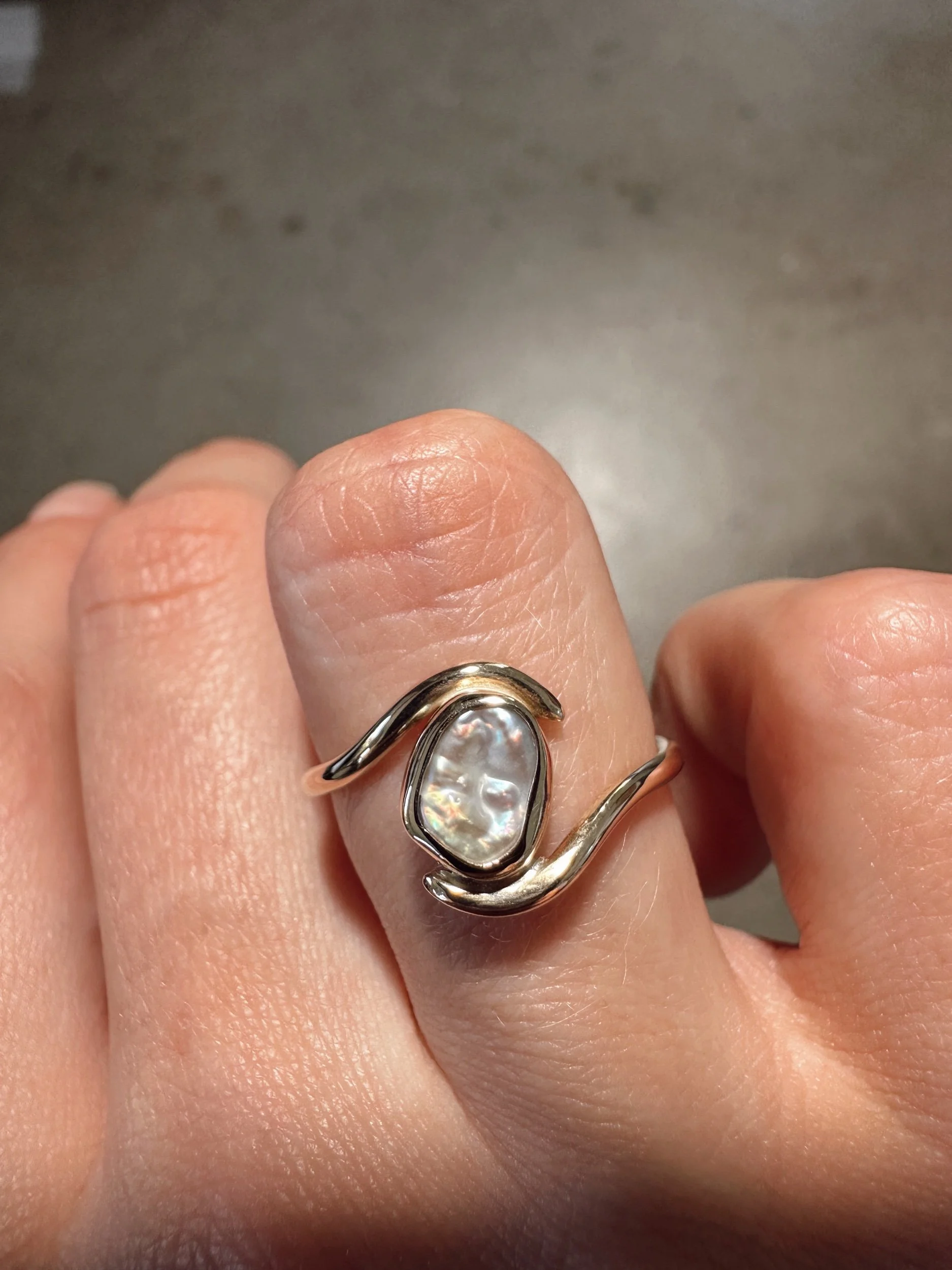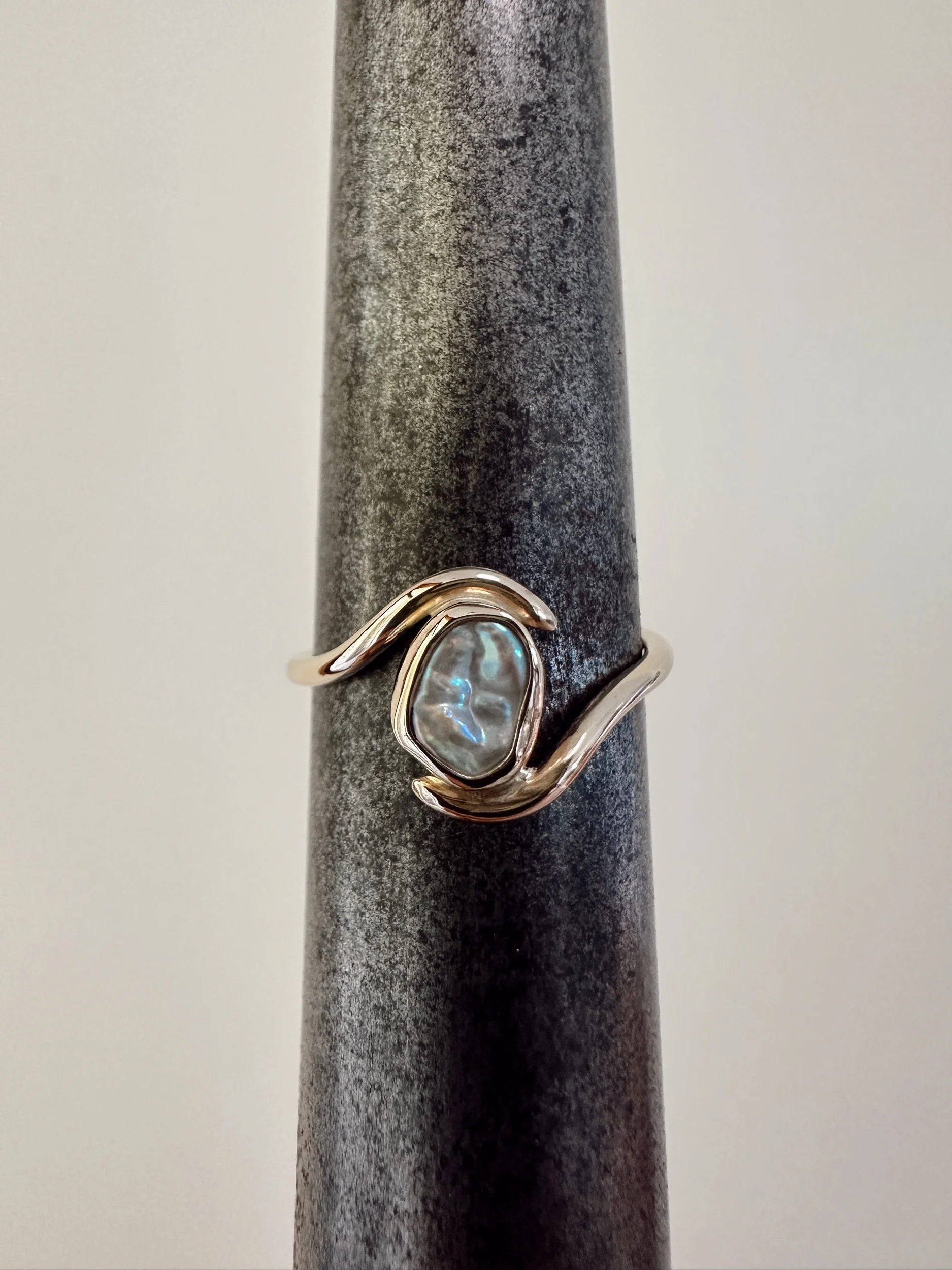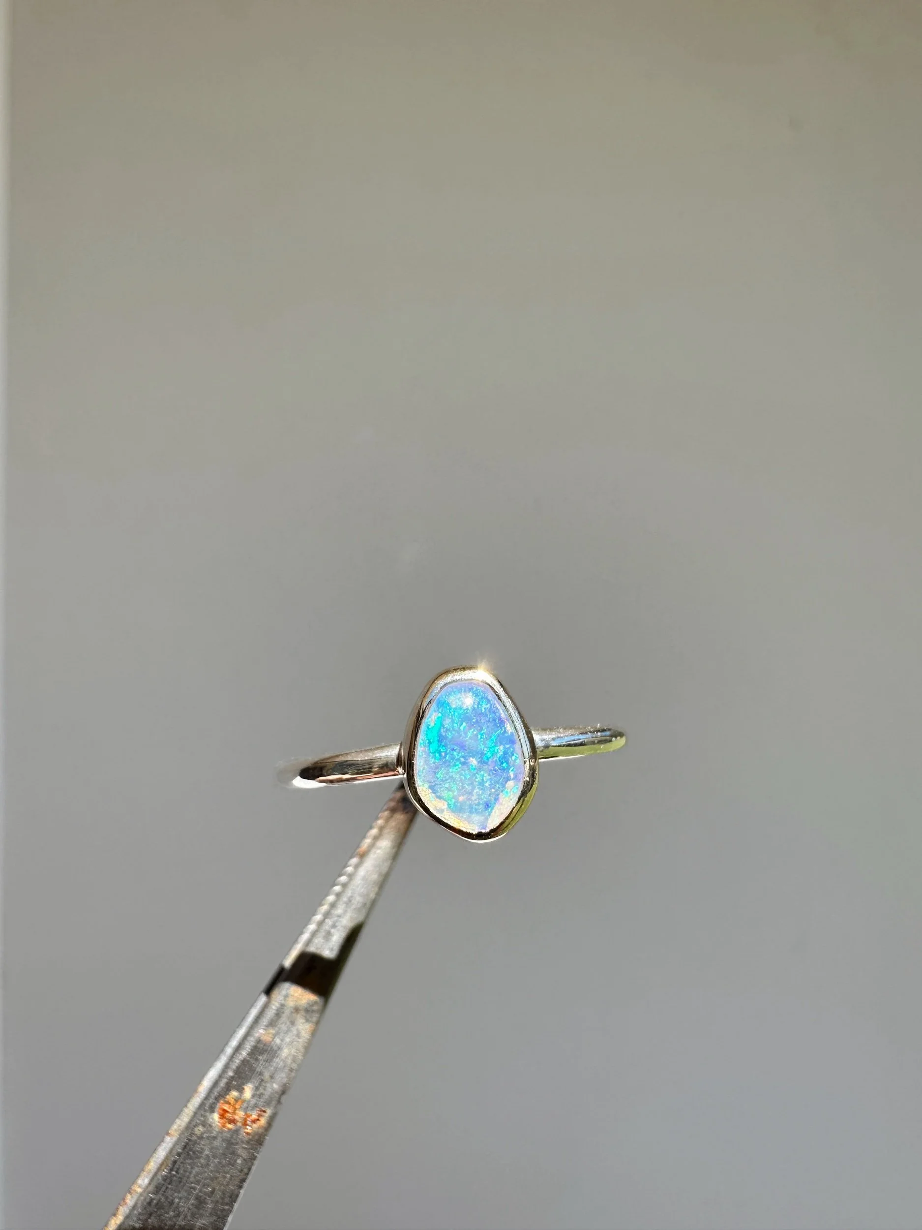 A pastel blue hued crystal opal wrapped in a snug 9ct gold bezel. Set on a .925 sterling silver shank.
