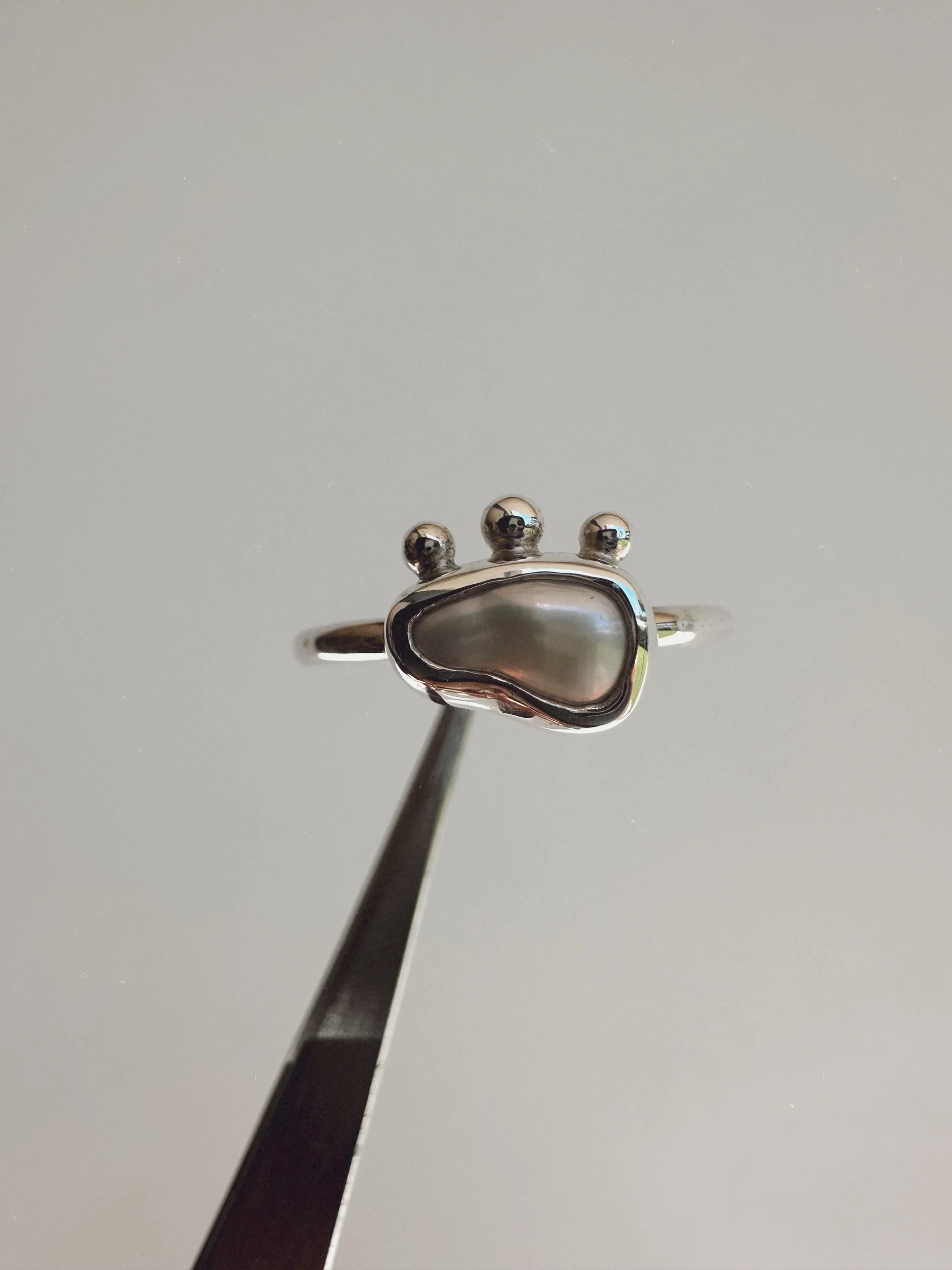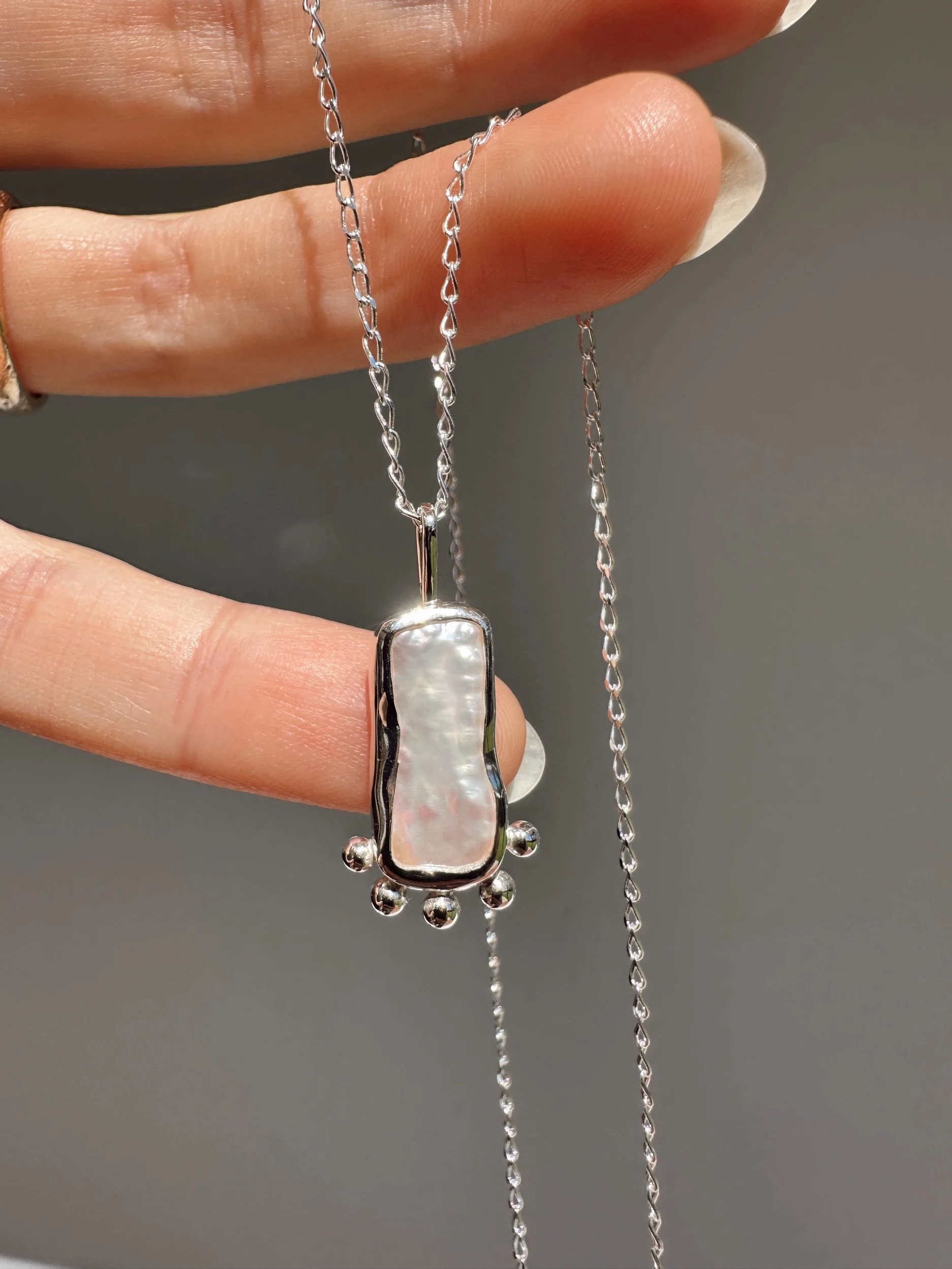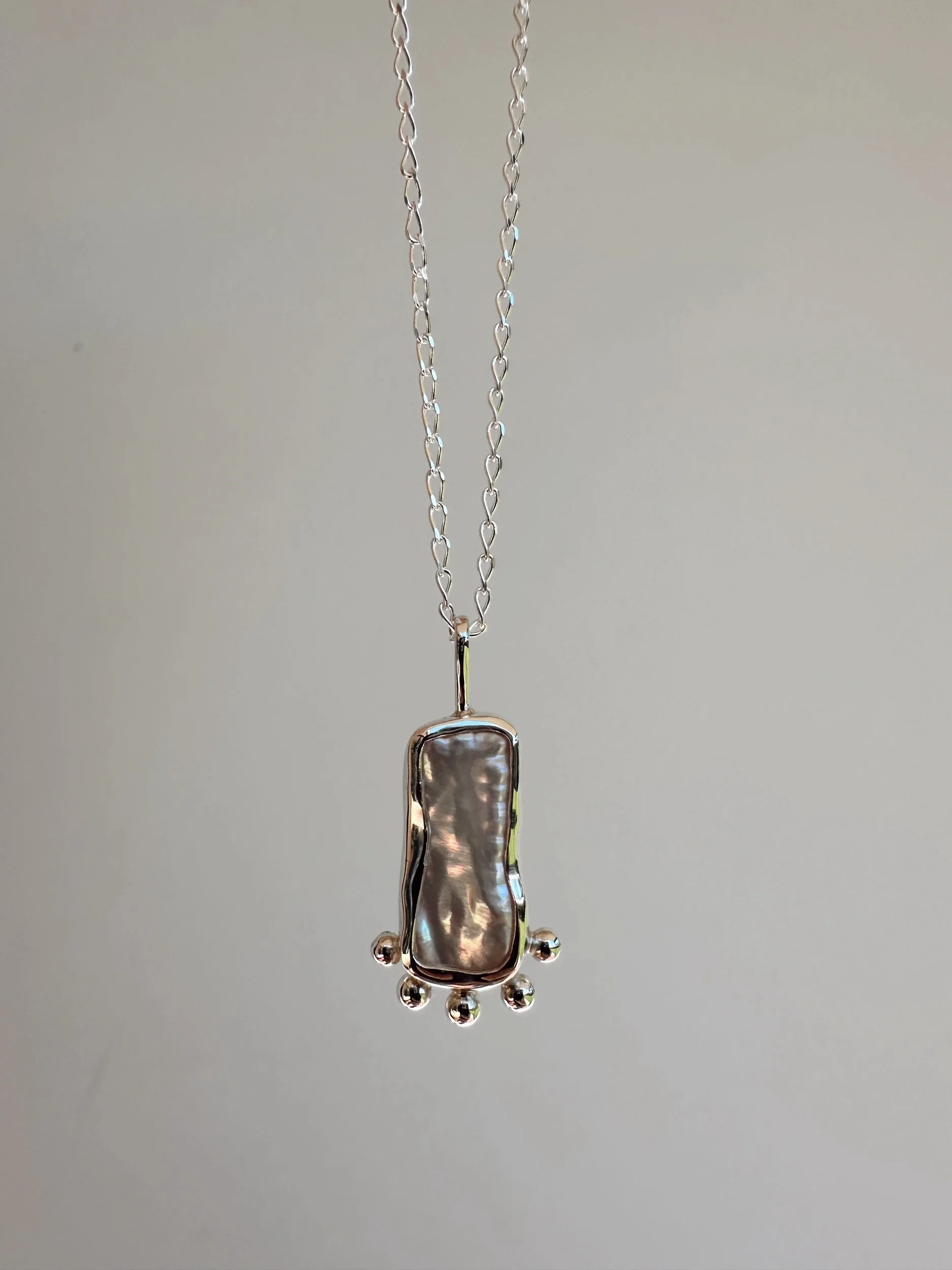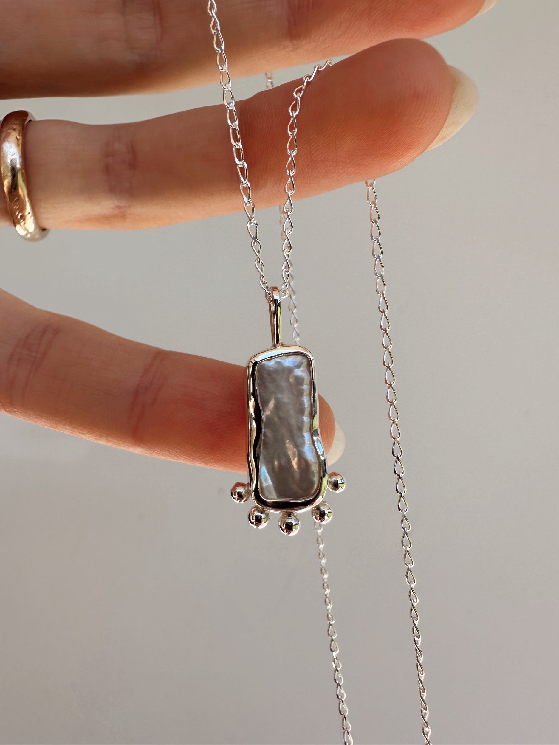 A chunky, elongated freshwater pearl set in a snug bezel. Finished off with silver dots.