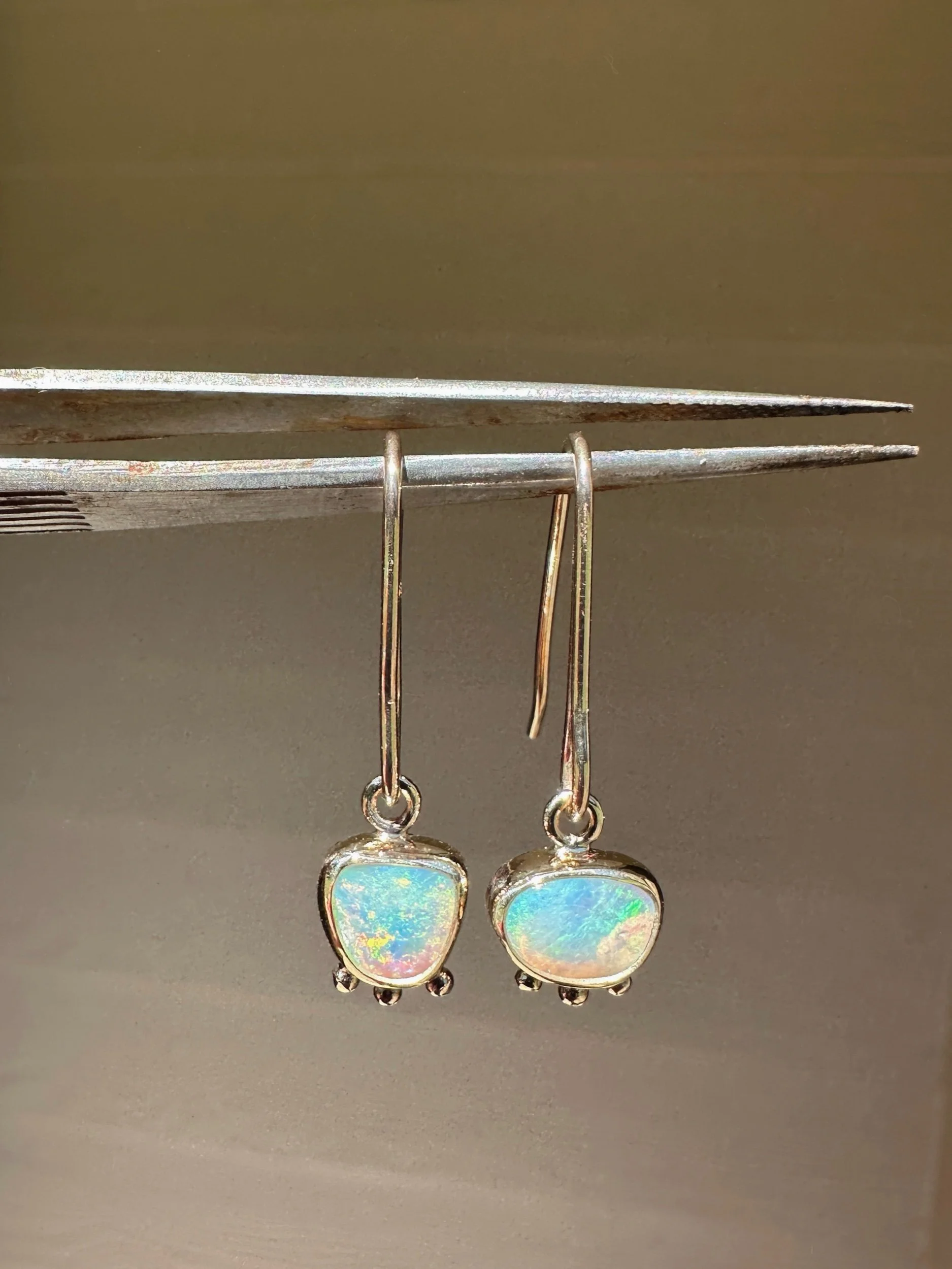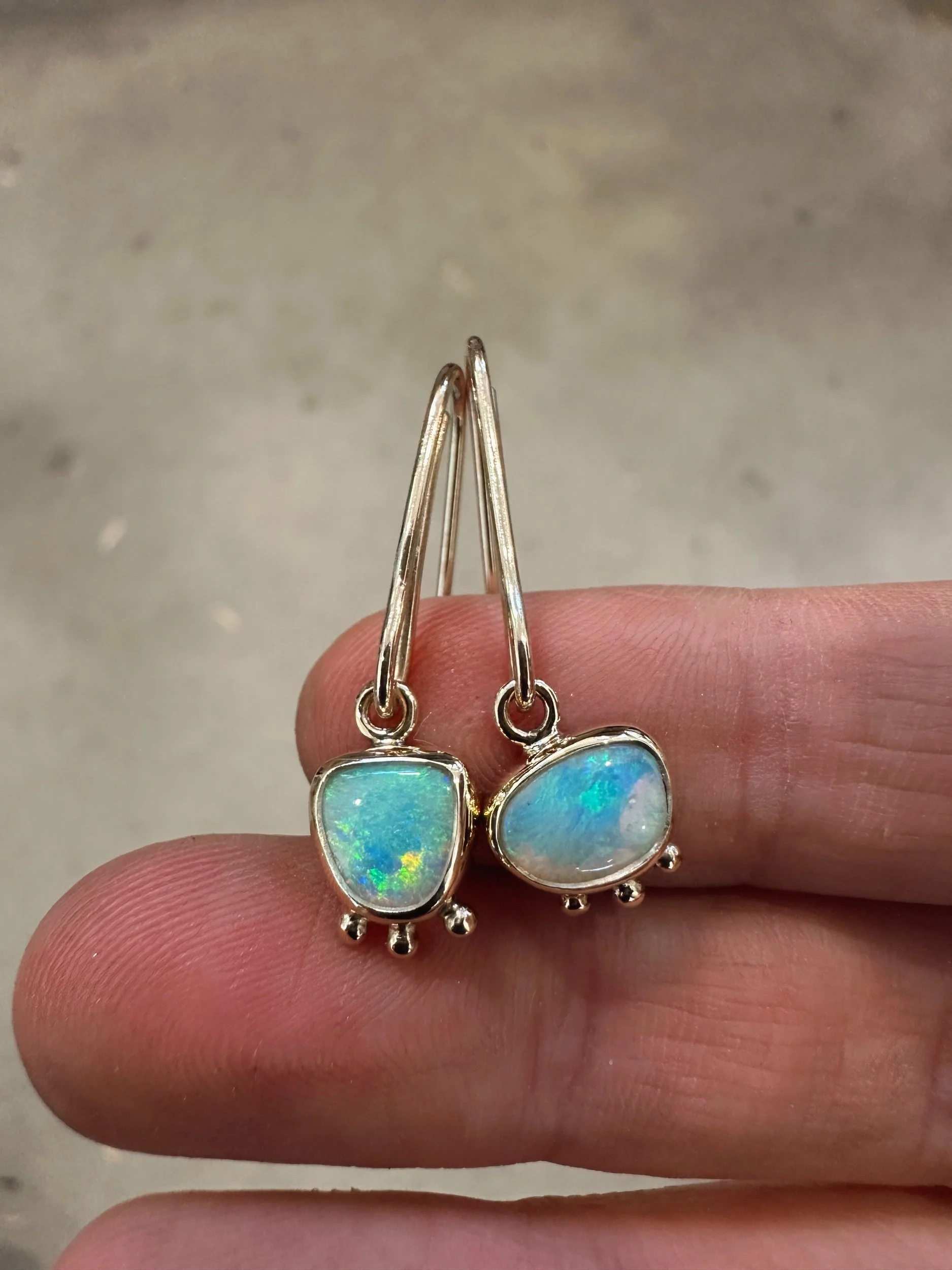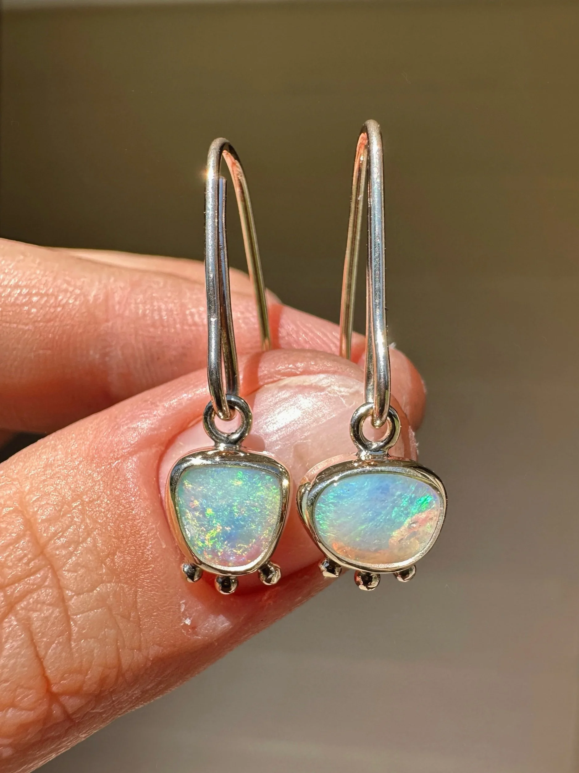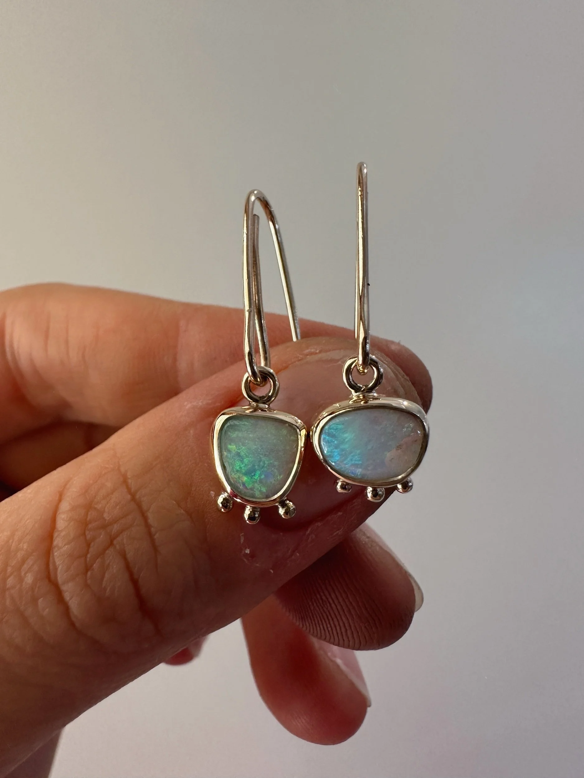 Two sweet crystal opals wrapped in snug bezels adorned with a trio of gold dots. Dangling from hand shaped hooks.