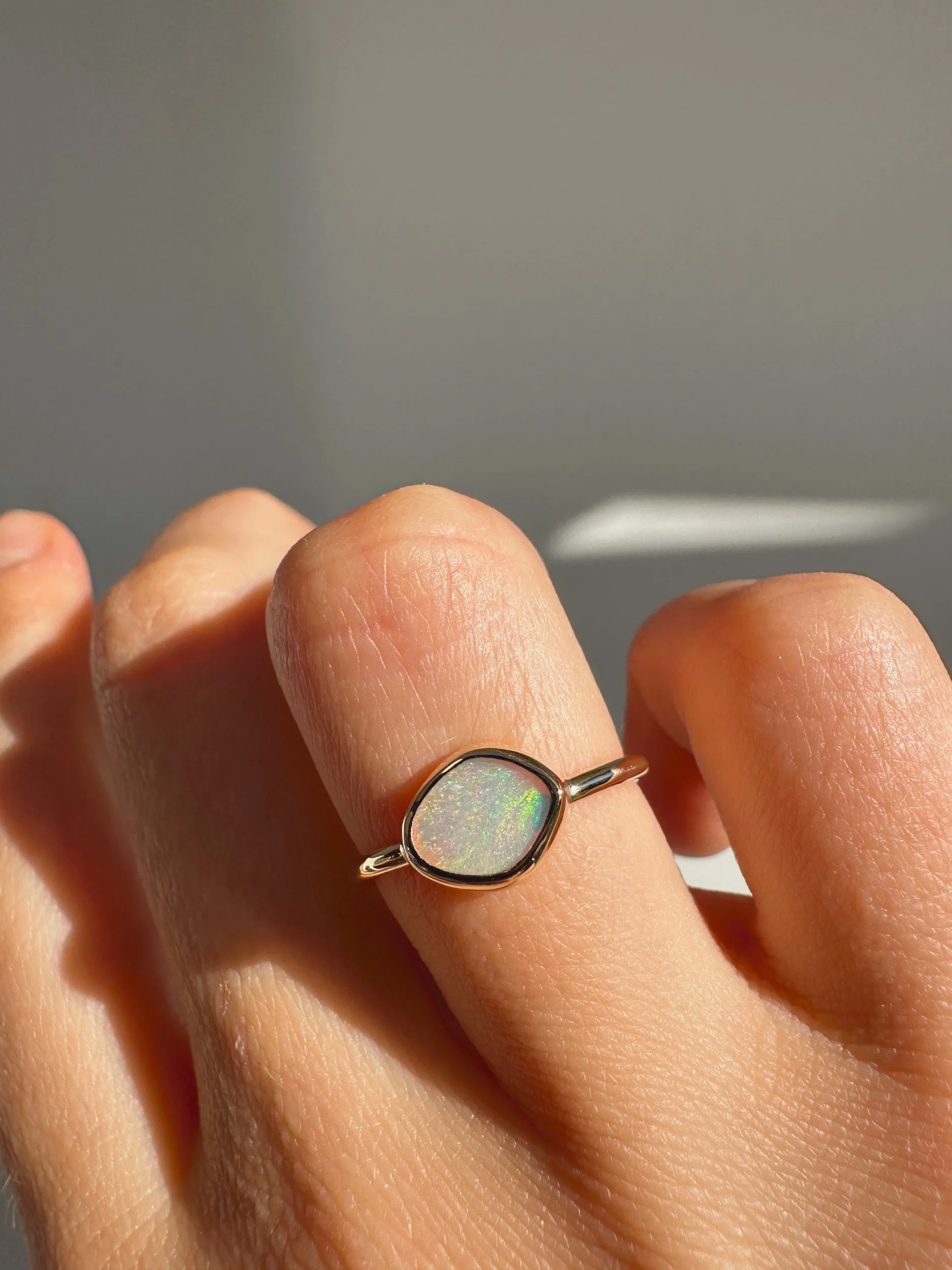 A milky crystal opal set snuggly in a bezel and shank. The opal boasts soft hues of greens, links and blues.