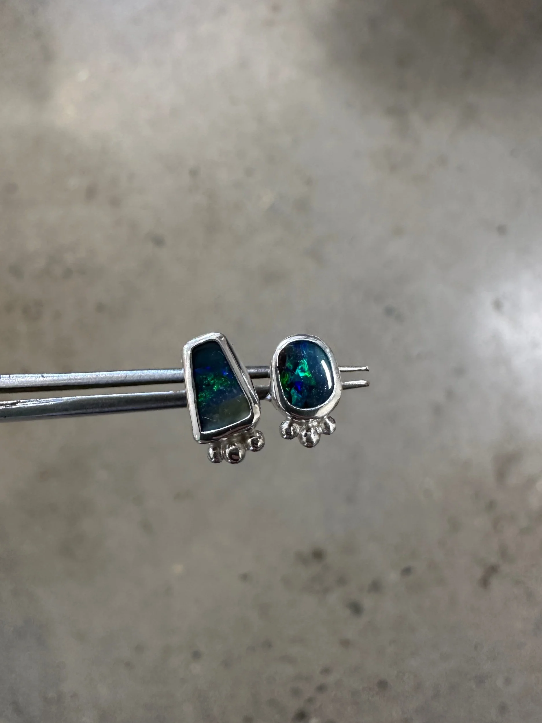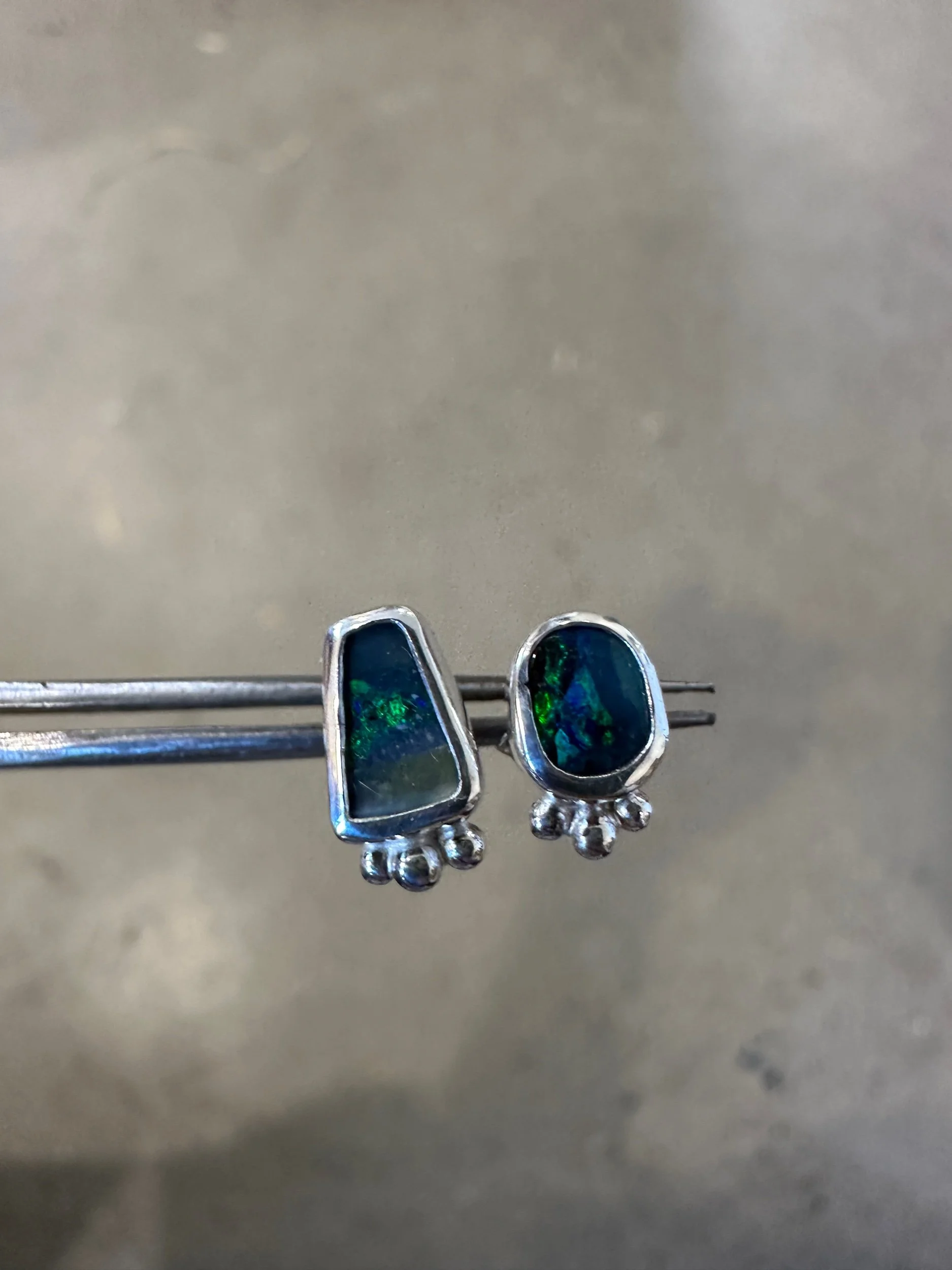 A sweet pair of mismatched boulder opals each featuring a unique dark blue and green pattern. Set in snug silver homes.